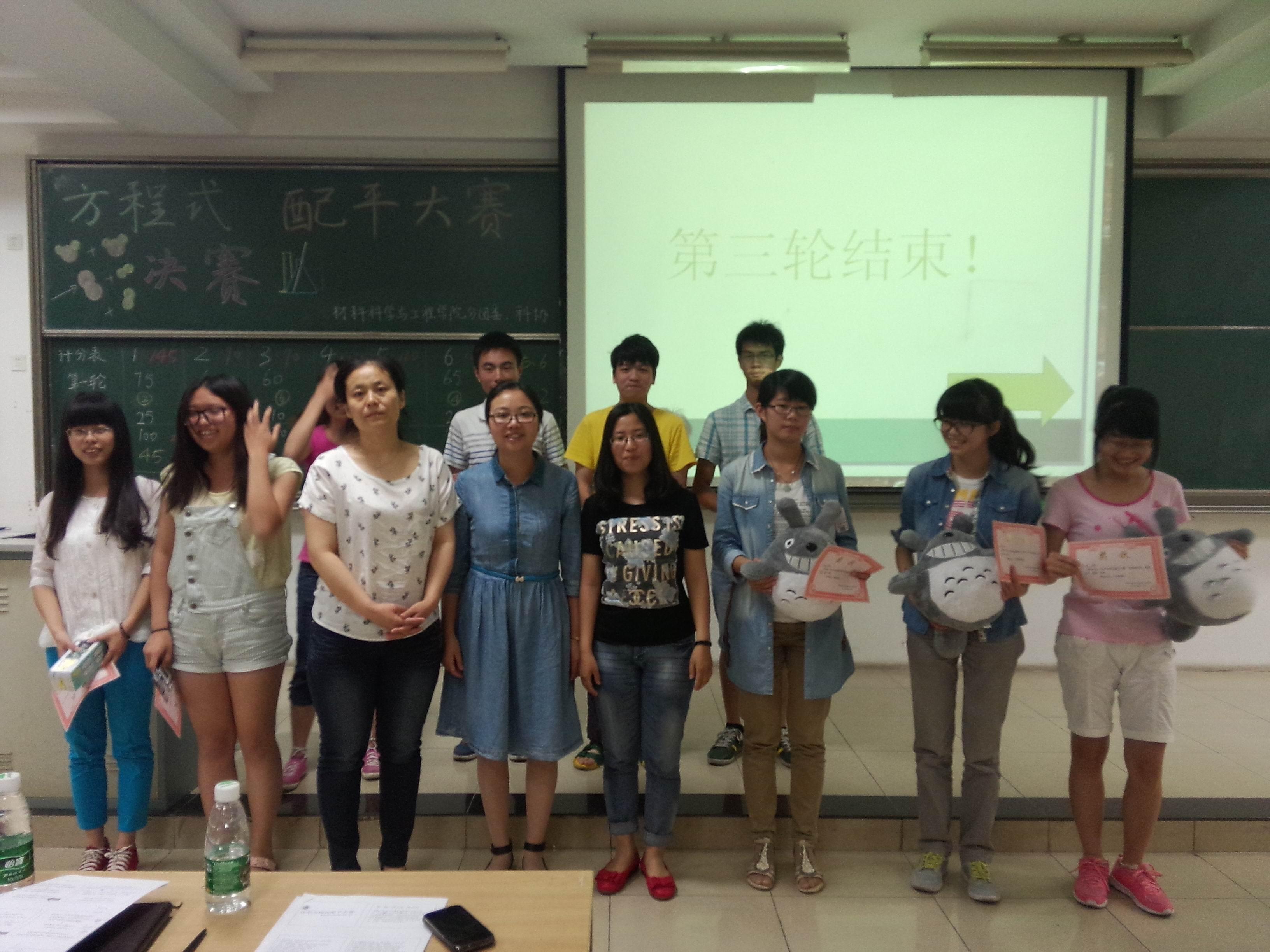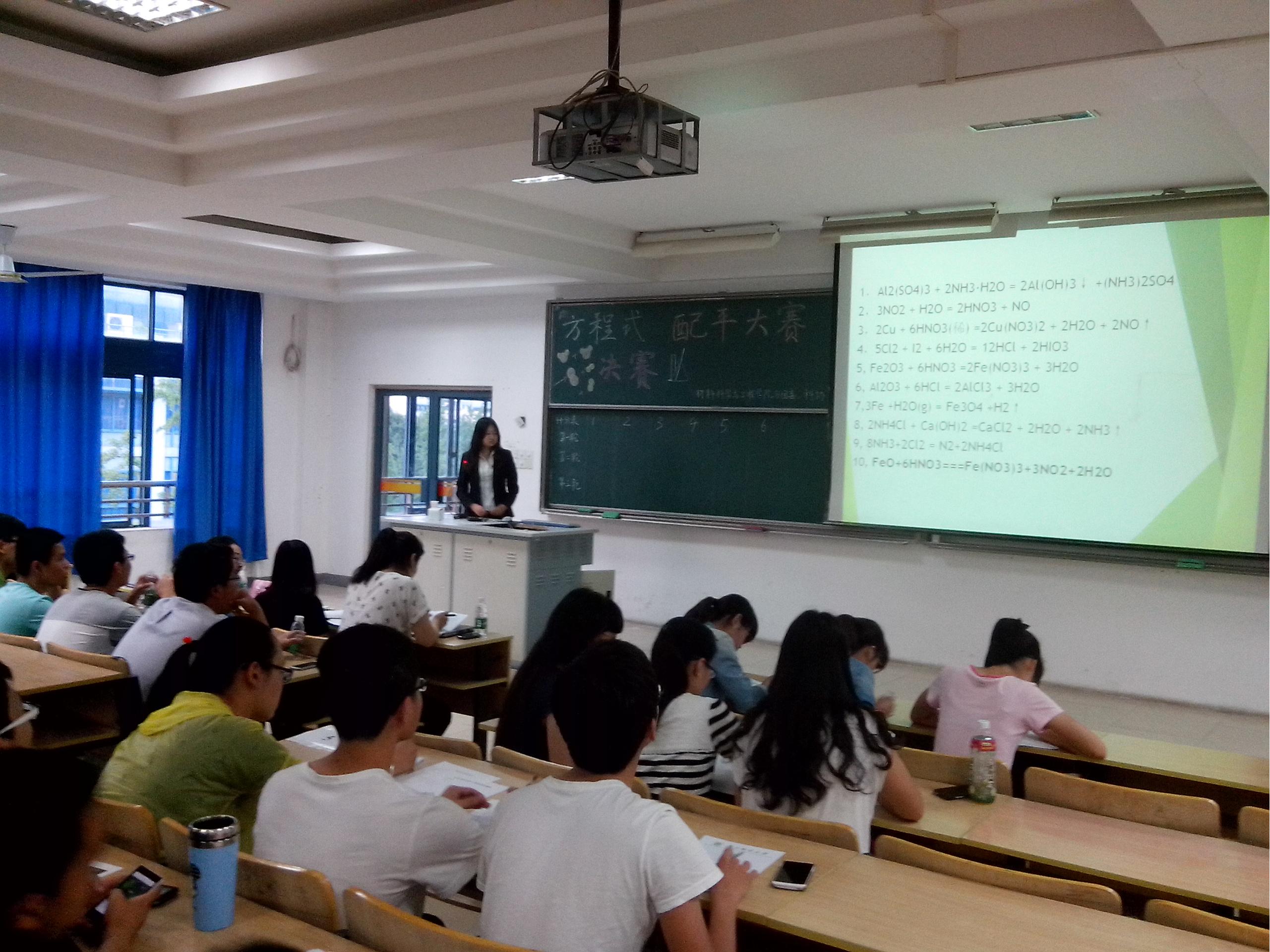 2014年6月5日晚,集知识性、趣味性于一体的“化学方程式配平大赛”决赛在教三402室成功举办。出席此次决赛的嘉宾有材料院分团委书记乔祖琴老师,材料院教师薛伟和郑超老师,以及材料院各个社团主席。此次比赛由suncitygroup太阳集团科协承办,旨在推广化学基础知识,提高员工团队合作能力,培养同学们的科学素养,使同学们在快乐中汲取知识,给全校对化学感兴趣的同学们一个展现自己的平台。