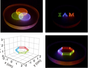 黄维院士介绍说,受限于发光材料固定波段、单一颜色发光的特点,二维彩色显示系统通常需要通过调控红、绿、蓝三种发光材料的颜色通道以及它们相互之间的叠加来得到彩色显示效果,即在显示器中,每个像素点都需要用薄膜晶体管独立控制,且每个像素点都包含红、绿、蓝三基色单元,这对工艺难度及器件稳定性都有很高的要求,也限制了显示器分辨率的进一步提高。此次开发的“全色”发光的透明纳米材料,将镧系金属离子精确掺入纳米粒子的核壳结构中,巧妙利用稀土离子间的能量传递、敏化和能量上转换技术,实现了透明无机纳米材料的“全色”发光。该纳米粒子能在不同红外激光脉冲的激发下,发出各种颜色连续可调的可见光,不需要独立的红、绿、蓝三基色,每个纳米颗粒即是一个像素点,将分辨率提高到纳米级。更为重要的是,将这些在可见光条件下透明的纳米颗粒均匀分散在三维空间中,通过肉眼不可见激光的激发和调制,可以发出多种不同颜色的可见光,从而实现真正意义上的真实立体彩色显示,并在空间三个维度都达到纳米级的极限显示分辨率,这是传统显示方法所不能企及的,为立体显示技术提供了一条革命性的思路和途径。公司陈润锋副教授深入研究和模拟了该纳米粒子内部复杂的光物理过程,发现这类材料表现出的特殊光学性质受非平衡态下的光子转移、能量传递和上转换过程等控制。相关文章被刊登在最新一期的《自然• 纳米技术》(Nature Nanotechnology)杂志上,这也是黄维院士和陈润锋副教授领导的课题组连续在化学学科国际顶级期刊—《德国应用化学》(AngewandteChemie-International Edition,2013年)和材料科学领域国际顶级期刊—《先进材料》(Advanced Materials,2014年)发表出色工作之后,取得的又一重大科学研究成果。