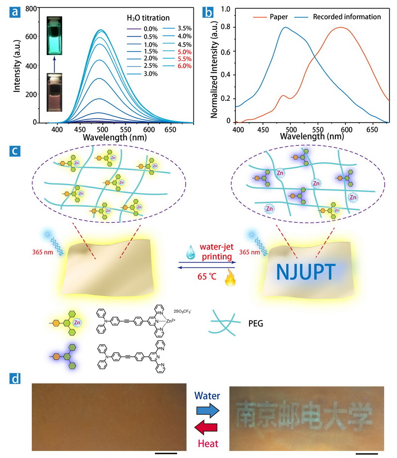 近年来,再写纸由于具有环境友好、价格低廉、节约资源等优势引起了学术界与产业界越来越多的关注。然而,如何在再写纸上实现保存时间长的多色喷墨打印还是一个尚未突破的技术难题。因此,再写纸的实际应用一直颇受限制。该团队利用金属-配体动态配位这一原理发展了可彩色打印并能长久保存的再写纸制备技术。以不同的金属盐水溶液作为墨水,喷墨打印图案或文本时会与纸上的配体配位,从而使纸张改变颜色。由于可用的金属盐种类丰富,因此可以打印出丰富多彩的颜色。进一步,利用纯水可以调控配位键引起发光颜色的改变,从而实现绿色环保的无墨喷水打印。该项工作是黄维院士、赵强教授研究团队再次在Nature Communications上发表响应性光功能材料的相关工作。该工作第一作者为公司马云副教授与博士生佘鹏飞。
