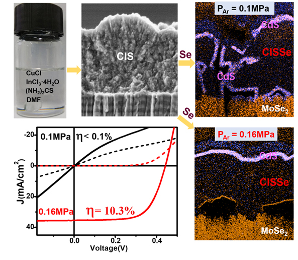 近期,suncitygroup太阳集团信息材料与纳米技术研究院辛颢课题组以DMF为溶剂制备了可在室温下长期稳定存放的前驱体溶液,并由该溶液经旋涂、退火、硒化制备铜铟硒(CIS)吸光层材料和太阳能电池器件。他们发现,在常规(1大气压)条件下进行硒化反应得到的吸光层薄膜晶粒松散、膜层中存在纵向贯穿的空隙,导致化学浴沉积的CdS缓冲层渗透并贯穿了吸光层,造成器件短路,光电转换效率小于0.1%。通过增加硒化反应的气氛压力(1.6大气压),抑制了铟元素的丢失,得到贫铜的多晶薄膜,晶粒排布致密,CdS层在薄膜表面分布平整,电池光电转换效率提高到10.3%。而且,加压条件下制备的CIS膜不需要KCN、(NH4)2S等溶液的刻蚀来除掉表面杂相,简化了工艺,降低了对环境的影响。