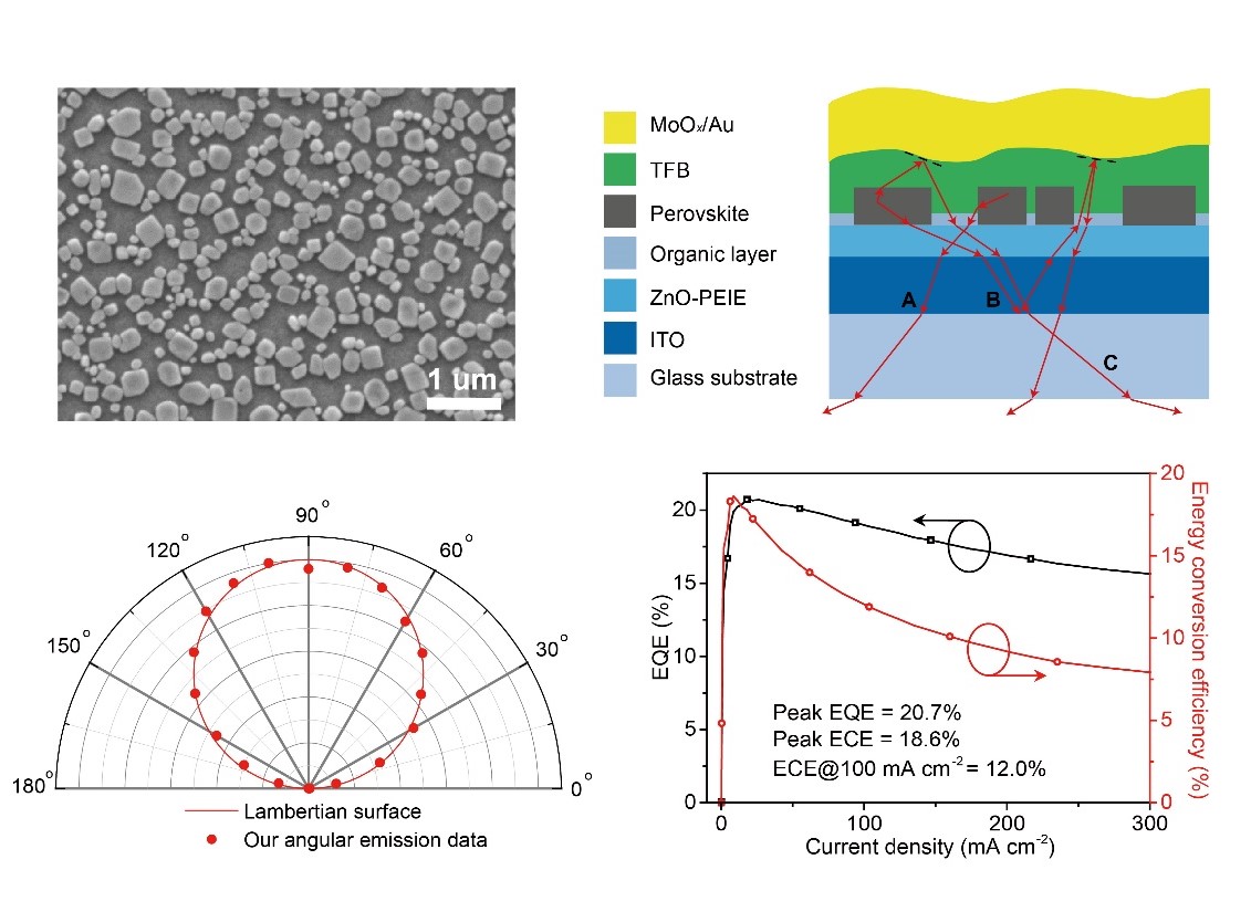 为突破这一世界性的重大科学难题,黄维院士和王建浦教授所带领的研究团队,通过一种简单的低温溶液法,实现了由一层非连续、不规则分布的钙钛矿晶粒和嵌入在钙钛矿晶粒之间的低折射率有机绝缘层组成的发光层,进而大幅度地提高了LED的光提取效率。据该研究主要负责人、南工先进材料研究院常务副经理王建浦教授介绍,使用该方法制备的LED器件外量子效率达到20.7%,在100 mA cm-2的电流密度下能量转化效率达到12%。此外,通过与浙江大学田鹤教授、戴道锌教授团队之间的合作,他们发现该方法形成的非周期性结构可以将LED光提取效率提高10个百分点。