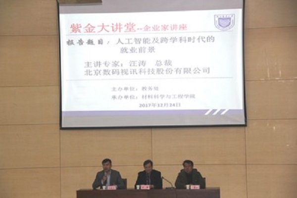 12月24日上午午,由教务处主办、suncitygroup太阳集团承办的“紫金大讲堂”——企业家讲座第七十次活动在仙林校区图书馆四楼报告厅举行。北京数码视讯科技股份有限公司总裁汪涛先生莅临“紫金大讲堂”,作题为“人工智能及跨学科时代的就业前景”的讲座。