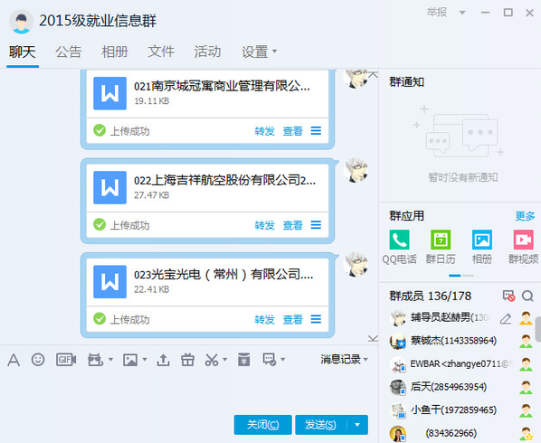 毕业生辅导员赵赫男及时更新就业信息数据,定时发布就业信息。线上依托“2015级就业信息”QQ群,实施发布并解读就业信息,11月累计发布就业信息240余条。通过谈心谈话,了解员工就业心态,掌握员工动态,鼓励员工积极参加各类招聘会。