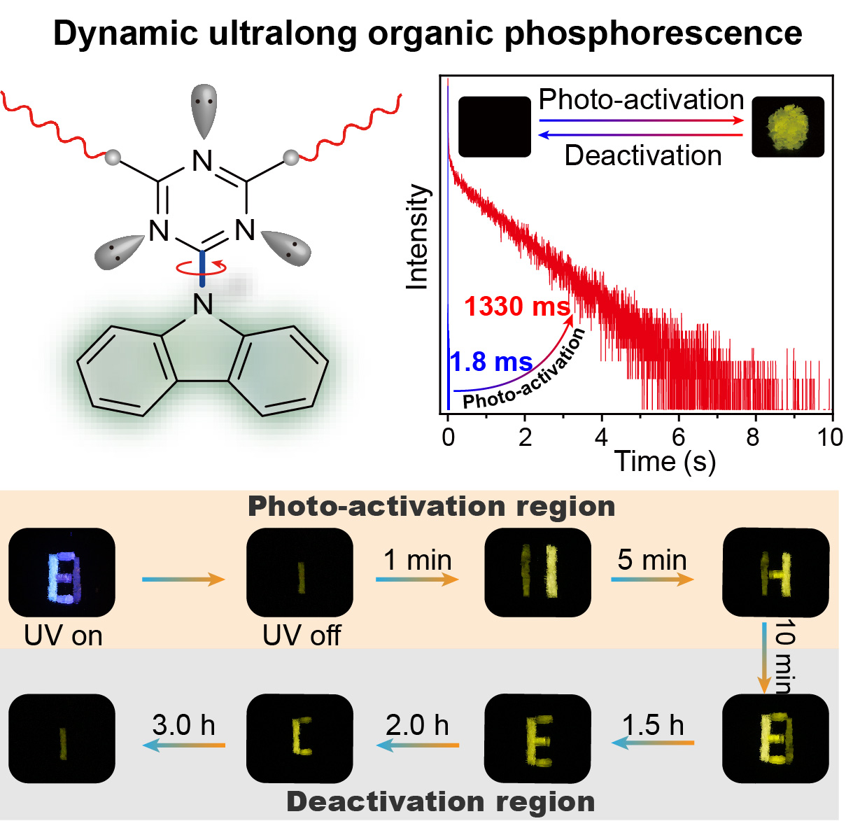超长有机磷光材料,俗称有机“夜明珠”,即撤去激发光源后,仍能持续发光数秒至数小时的发光材料。该类材料由于具有长寿命,大的斯托克斯位移以及丰富的激发态性质被广泛的应用于防伪、加密以及生物成像等领域。近年来,虽然通过合理的分子设计以及材料设计得到了一系列长寿命以及高效率的静态超长有机磷光材料,但是对于更加智能化的动态超长有机磷光至今鲜有探索。众所周知,通常具有动态特性的材料会赋予光电器件一些革新性的性能,例如光诱导分子结构改变的动态特性已经被成功的用于了可逆的光学开关以及光学存储器器件中。另外,利用分子马达或分子转子制动器的动态特性将外界刺激有效的转化为其机械运动,进而促使其在微环境中执行特殊的生物或者医学功能等。因此开发一种新型的具有动态特性的超长有机磷光材料显得尤为重要。