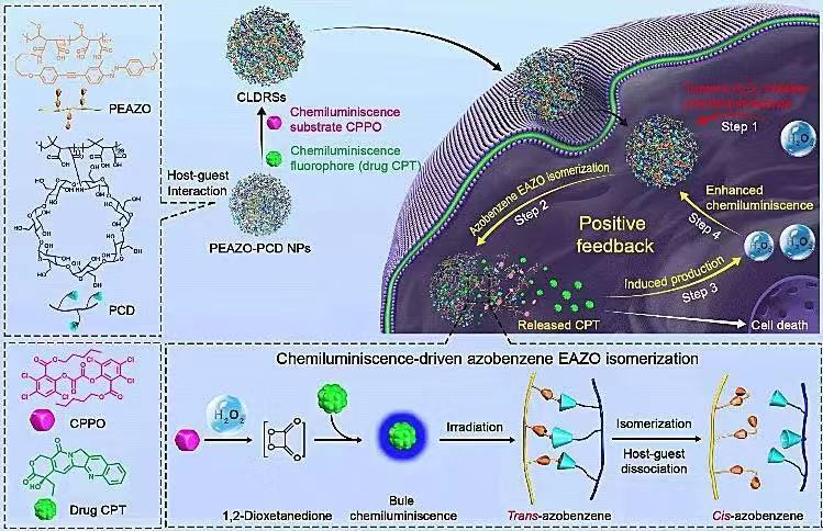 近日,suncitygroup太阳集团IAM团队范曲立教授团队在Chemical Science上发表文章,该团队人员利用靶向特异性启动和原位增强化学发光(自发光的一种)策略克服了缺乏靶向特异性高强度原位发光的局限性,实现了靶向特异性且组织深度无依赖的光致异构化。考虑到光致异构化在疾病特异性化疗的药物控制释放领域具有可观的应用前景,他们通过肿瘤特异性化学发光控制的药物化疗来阐述他们的原位发光驱动异构化策略的适用性。具体地,化学发光底物和化学发光荧光团(抗肿瘤药物,CPT)共同包封在由环糊精和低强度光异构化的偶氮苯组成的主-客体载体中。肿瘤组织高浓度过氧化氢诱导的化学发光初步启动偶氮苯异构化,引发主-客体载体的部分解离,从而导致CPT的初步释放。进一步地,最初释放的CPT在肿瘤组织原位诱导产生更高浓度的过氧化氢,实现了原位增强的化学发光,确保靶特异性增强的偶氮苯异构化和CPT释放。