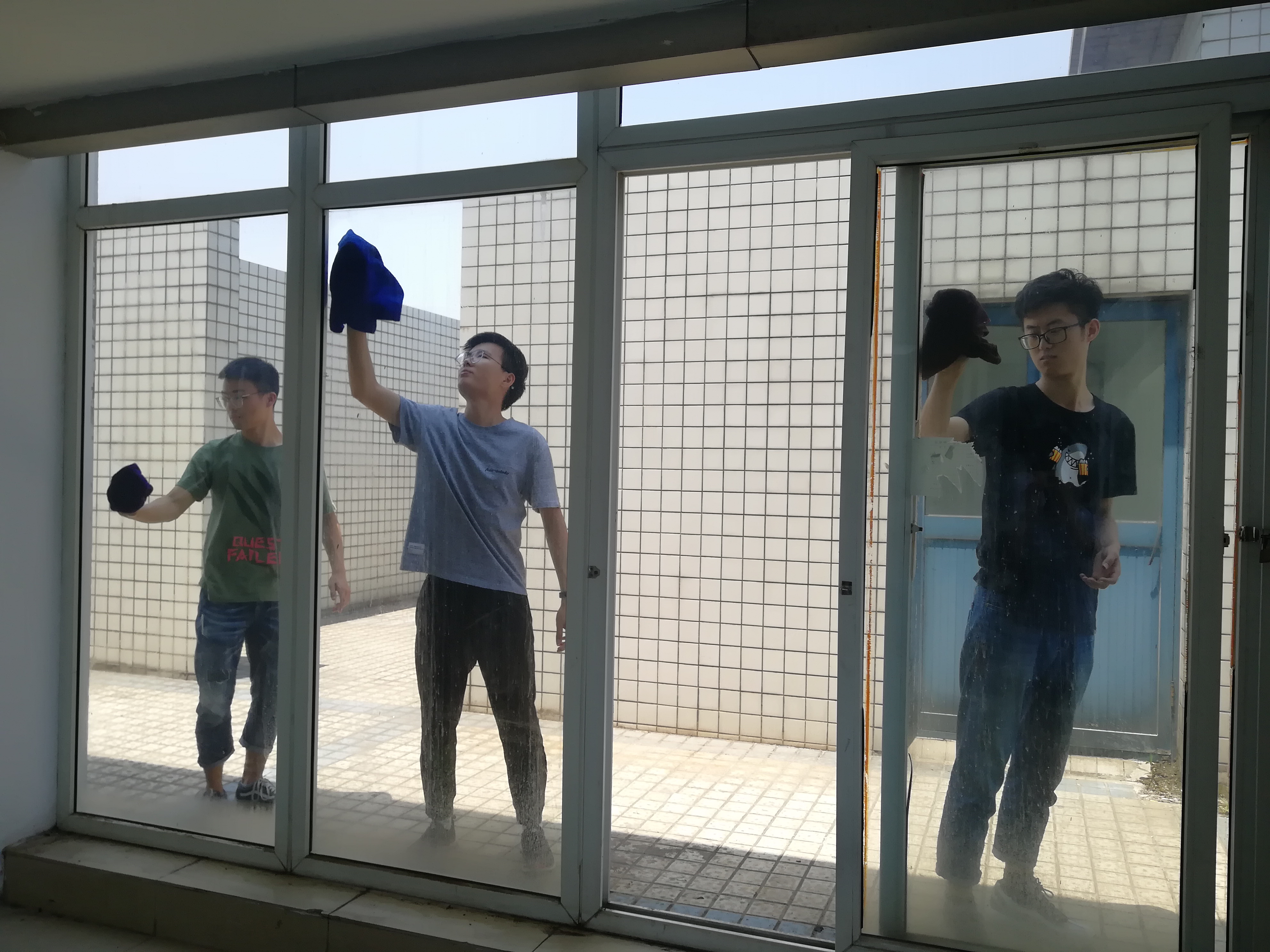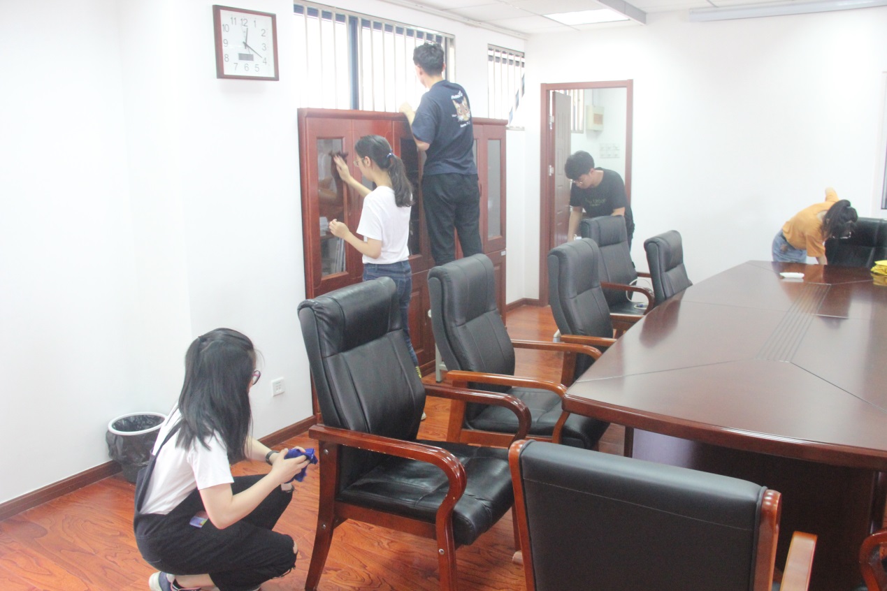 6月3日中午11时,“担一份责任”党员义务卫生清扫日活动如期举行,由学工党支部书记、2015级辅导员赵赫男带领的学工党支部全体共计40余名党员在教5楼集合,开展了本学期教5楼的清洁工作。本次清洁的地点为教5楼4间会议室和教师活动室,员工党员分为5组开展工作,经过近一个半小时的打扫,室内环境卫生得到了较大的改善。