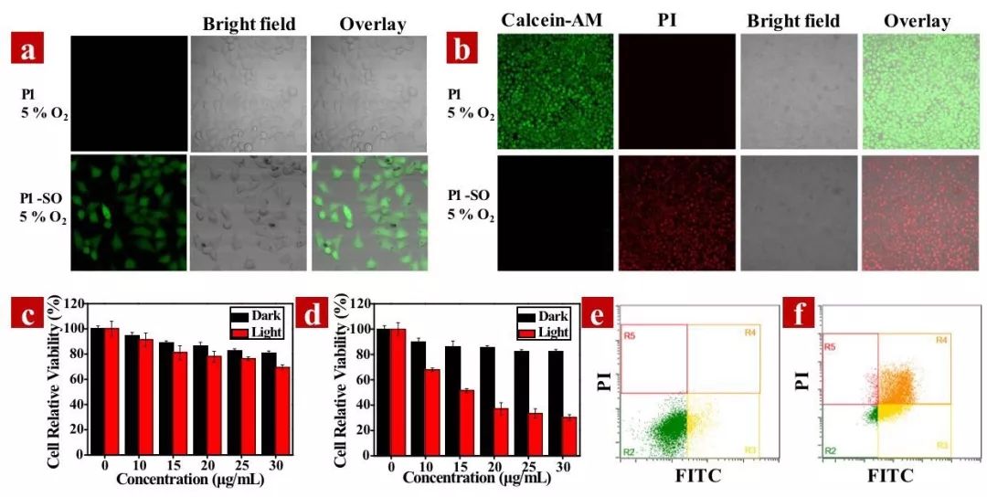接着,作者研究了P1-SO在癌细胞中的光动力治疗效果(图3)。发现在光照后,P1-SO可以在乏氧的癌细胞中释放大量的单线态氧,具有较强的光毒性,并对乏氧癌细胞有很好的光动力治疗效果。