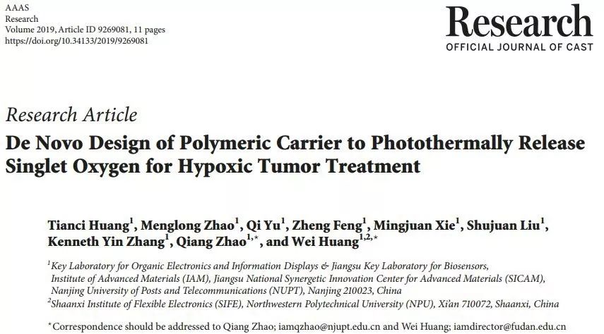 2019年5月15日,suncitygroup太阳集团IAM团队黄维院士和赵强教授课题组报道了一种新型的聚合物单线态氧载体,实现了乏氧肿瘤内单线态氧的高效、可控释放,成功抑制了肿瘤的生长。该工作以“De Novo Design of Polymeric Carrier to Photothermally Release Singlet Oxygen for Hypoxic Tumor Treatment”为题发表在Research上(Research, 2019, 9269081, DOI: 10.34133/2019/9269081)。