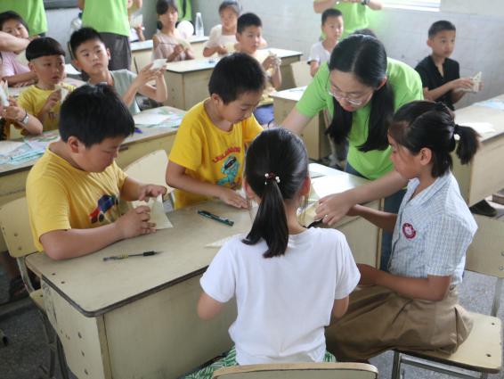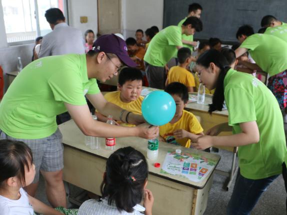 实践团的同学们为孩子们带来了一场关于“垃圾分类”的环保讲座。同学们向孩子送上精心设计的环保单页,在与孩子们的互动中教会孩子区分“干垃圾”、“湿垃圾”、“有害垃圾”和“可回收垃圾”,并结合专业知识特点带领孩子开展趣味化学实验。实践团的成员们分成若干小组,走下讲台,协助孩子共同完成实验。