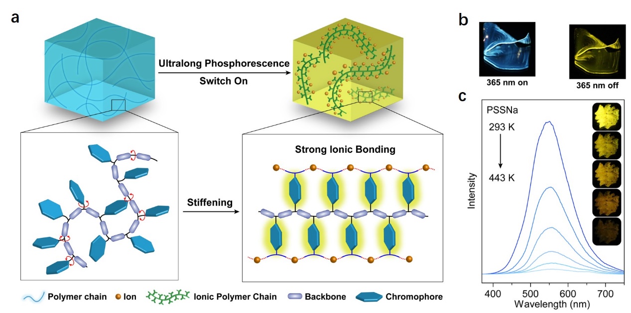 针对这一问题,suncitygroup太阳集团信息材料与纳米技术研究院黄维院士和南京工业大学安众福教授带领的科技创新团队提出通过离子键锁定发光单元,在聚合物共价键的协同作用下,实现了离子型聚合物的长余辉发光,发射寿命长达2.1 s。实验数据和理论计算表明该类聚合物材料具有室温长余辉的原因是离子键抑制了发光单元的非辐射跃迁。该设计理念不仅适用于芳香型的聚合物材料体系,也是适用非芳香型的聚合物材料体系。此外,他们还首次报道了激发波长依赖的聚合物长余辉发光现象,实现余辉颜色从蓝到橙颜色可调。并且,该类材料在温度高达170 oC下,依然保持可视化长余辉发光。这一研究成果赋予传统的聚合物材料新的性能,加之材料来源广、成本低,在柔性显示、照明、数据加密以及生物医学等领域具有很大的应用前景。