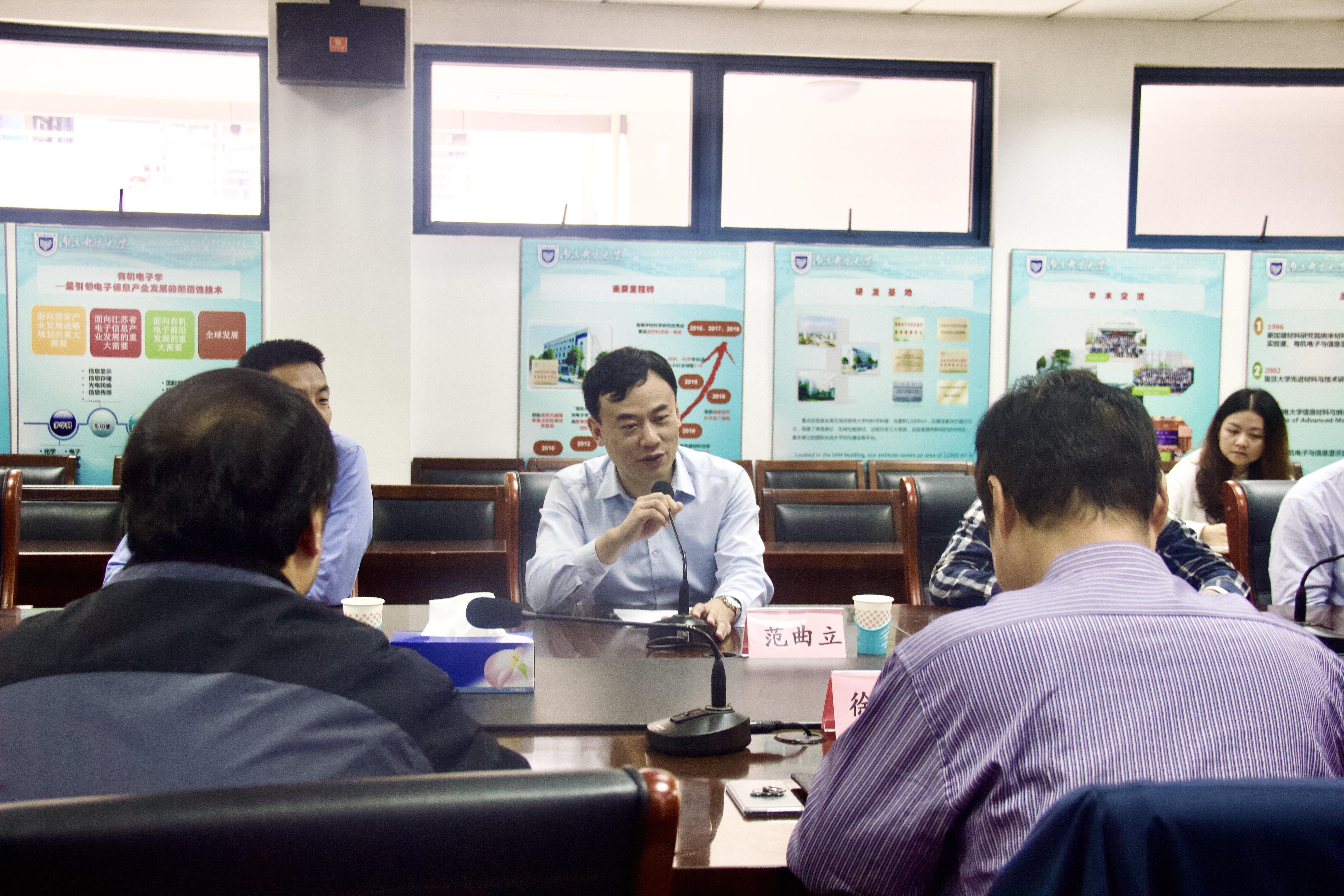 首先,范曲立经理对来访的西安邮电大学理公司一行表示热烈欢迎,并对材料院的情况进行了简单的介绍。材料物理专业系主任张新稳副教授介绍了公司材料团队建设的总体情况,并详细介绍了材料物理专业目前总体情况、团队力量、专业特色方向、培养方案、学科竞赛成果以及升学就业情况等。副经理解令海教授在如何建设专业实验室方面也给出了合理的建议。