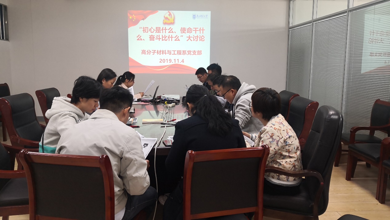 为扎实推进“不忘初心、牢记使命”主题教育,2019年11月4日下午,高分子材料与工程系党支部在教五-410会议室开展“重读入党志愿、重温入党誓词”活动。活动由支部书记黄艳琴老师主持,本支部全体党员参加。