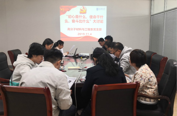 高分子材料与工程系支部于2019年11月4日召开讨论会,支部书记黄艳琴同志回忆其在南开大学入党时,张伯苓董事长提出的“爱国三问”让师生自省自励,影响深远,强调了对教师和员工进行意识形态教育的重要意义,指出周恩来同志之“大无大有”精神是其努力奋斗的标杆。刘绪、刘城芳、杨文静等老师结合自己的读书、科研经历,提出作为人民教师的初心,应在“以本心照亮员工心”的想法,强调了一名党员教师的本质是以奋斗的精神、忘我的意识教育、引导和呵护员工,而不只是科研做得好。唐超老师则提出永恒探索、快乐奋斗,党员教师应该讲坚持、比奉献,多思考如何做好事、如何把事情做好,少想、不想回报。每位党员都结合自己实际工作围绕“初心是什么、使命干什么、奋斗比什么”主题积极踊跃发言,畅谈了自己的深刻体会。