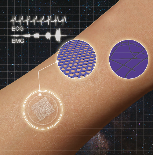 表皮电子器件(Epidermal Electronics)是可以贴合或者植入人体的电子器件,是柔性电子领域的重要组成部分。这类电子器件在医疗健康与人机接口中有着广泛的应用。然而,目前的表皮电子器件大多数都制备在无孔隙的固态聚合物衬底上(如聚二甲基硅氧烷PDMS,聚对苯二甲酸乙二醇酯PET和聚酰亚胺PI)。这些材料缺乏透气性,会阻止汗液等皮肤分泌的挥发性成分散发,降低佩戴的舒适度,甚至有可能会产生过敏等现象。另一方面,这些材料较硬,难以和皮肤形成紧密接触,在长时间佩戴中容易脱落且不利于生物电信号的采集。因此,开发质地柔软的良好透气新材料作为衬底对于表皮电子设备的长时间应用十分重要。