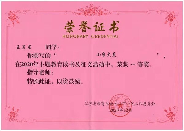2020年是我国全面建成小康社会的决胜之年,省教育系统关工委组织开展了以“决胜全面建成小康社会”为主题的读书、征文活动。公司积极响应本次活动,并从众多稿件中仔细挑选了王昊东同学和刘人珲同学的文章代表公司参加此次征文比赛,经校关工委遴选脱颖而出,而后经省教育系统关工委专家组多轮评审,分别获得一二等奖,为院争光。