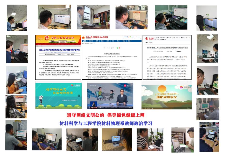 材料物理系党支部组织全系教师开展了主题为“遵守网络文明公约,倡导绿色健康上网”的政治学习,以必学材料学习与自学相结合的形式开展,将文件学习与视频案例学习相融合,分别学习了《全国人民代表大会常务委员会关于加强网络信息保护的决定》、《互联网信息服务管理办法》、《即时通信工具公众信息服务发展管理暂行规定》等文件,以及《维护网络生态,筑牢精神家园》、“发圈”别“出圈”、《知法懂法、依法办网、维护网络安全》等视频资料。通过学习,大家一致认为上网要有节制,有目的、有选择地浏览信息,自觉抵制不良信息,要增强自我保护意识,要维护网络安全,不破坏网络秩序,要增强网络安全意识和法律意识,同时要在教学、科研过程中积极向员工倡导网络文明公约,帮助员工认识网毒危害,形成健康文明、积极向上的上网习惯。
