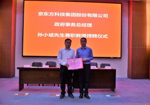 2021年5月27日下午,京东方科技集团股份有限公司政府事务总经理孙小斌先生受聘为公司兼职教授,聘任仪式由suncitygroup太阳集团组织承办,在仙林校区行政楼一楼报告厅举行。仪式上,suncitygroup太阳集团经理范曲立教授致欢迎辞,蒋国平副董事长向孙小斌先生颁发兼职教授聘书和校徽,衷心祝贺孙教授加盟南邮,员工代表为孙教授佩戴校徽。