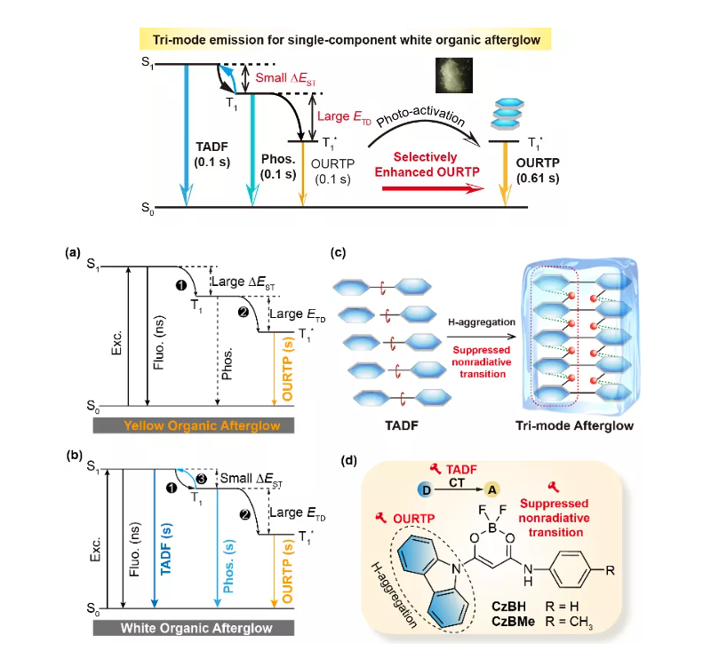 由于难以通过分子的不同激发态实现长寿命荧光实现互补性余辉,因此目前在获取单组分白色有机余辉材料中表现非常大的挑战。公司黄维院士和陈润锋教授团队报道发展了一种单重态S1、三重态T1、稳定三重态T1*的三重模式发光实现了白色有机余辉分子材料,这种白色有机余辉通过调控单重态-三重态能量差(ΔEST)、激子俘获深度ETDexciton trapping depth)实现。