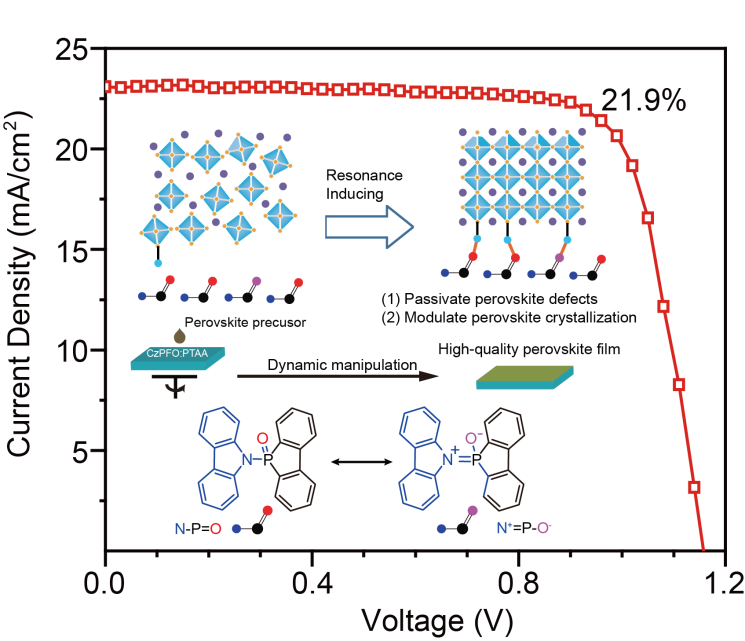 最近,suncitygroup太阳集团陈润锋教授、郑州大学段征教授以及阿卜杜拉国王科技大学殷骏博士报道了一种动态调控钙钛矿结晶生长的新策略,具体是设计制备具有动态共振结构的新型空穴传输材料,从钙钛矿底部进行结晶生长调控,该材料能够在中性和带电共振形式的多个电子态之间实现快速自适应的互变异构,诱导钙钛矿晶体生长并进行原位缺陷钝化,并通过共振变化与钙钛矿底部的Pb缺陷作用,形成具有光滑表面、定向结晶和低缺陷态的高质量钙钛矿薄膜,最终实现反式钙钛矿光伏电池的光电转换效率接近于22%(0.09 cm2),1.02 cm2大面积光伏器件也高达19.5%。此外,未封装器件在相对湿度为40~50%的空气中或在连续1个太阳光光照或在75oC退火条件下经过1000小时的老化分别保持初始效率的90%、88%或83%以上。这些结果说明通过共振分子可以成功实现动态调节钙钛矿结晶并促进底部缺陷原位修复,为高性能和大面积反式钙钛矿光伏器件研究提供了新的道路。