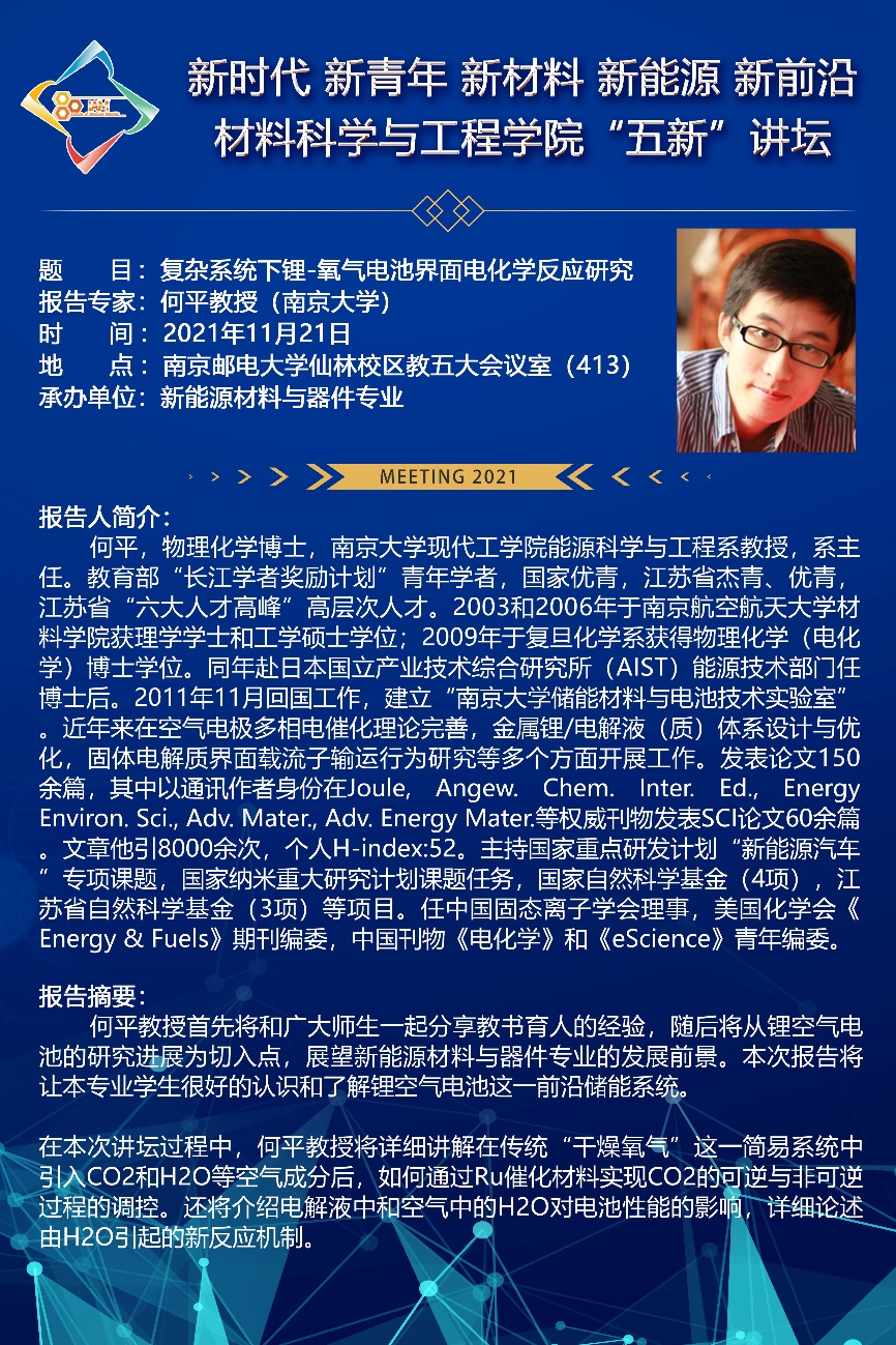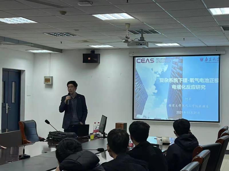 为促进新能源材料与器件本科专业员工的全面发展,增进同学们对本专业的认知和认同感,拓展本专业员工的国际视野,培养本专业员工的创新思维和创新能力,推进专业创新创业教育与专业教育的深度融合,实现为国家培养满足社会需求、掌握最新前沿技术和创新能力的新时代新能源材料高端人才的最终目标。2021年11月21日上午10:00,新能源材料与器件专业在公司教五413会议室成功举办了首期主旨为“新时代、新青年、新材料、新能源、新前沿”的“五新”讲坛专家报告会。此次讲坛的专家为南京大学现代工程公司新能源科学与技术专业系主任、国家优秀青年基金获得者何平教授。报告由新能源材料与器件专业系主任黄镇东副教授主持,新能源材料与器件专业的全体本科生和班主任闫伟博老师参加了本次报告会。