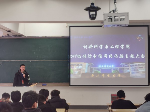 为提高员工的安全防范意识,增强自我保护能力,进一步维护自身的合法权益,2021年12月3日下午,在教4-201教室开展了以“预防电信网络诈骗”为主题的教育大会,本次大会由2019级辅导员王森主持,2019级全体员工参加大会。