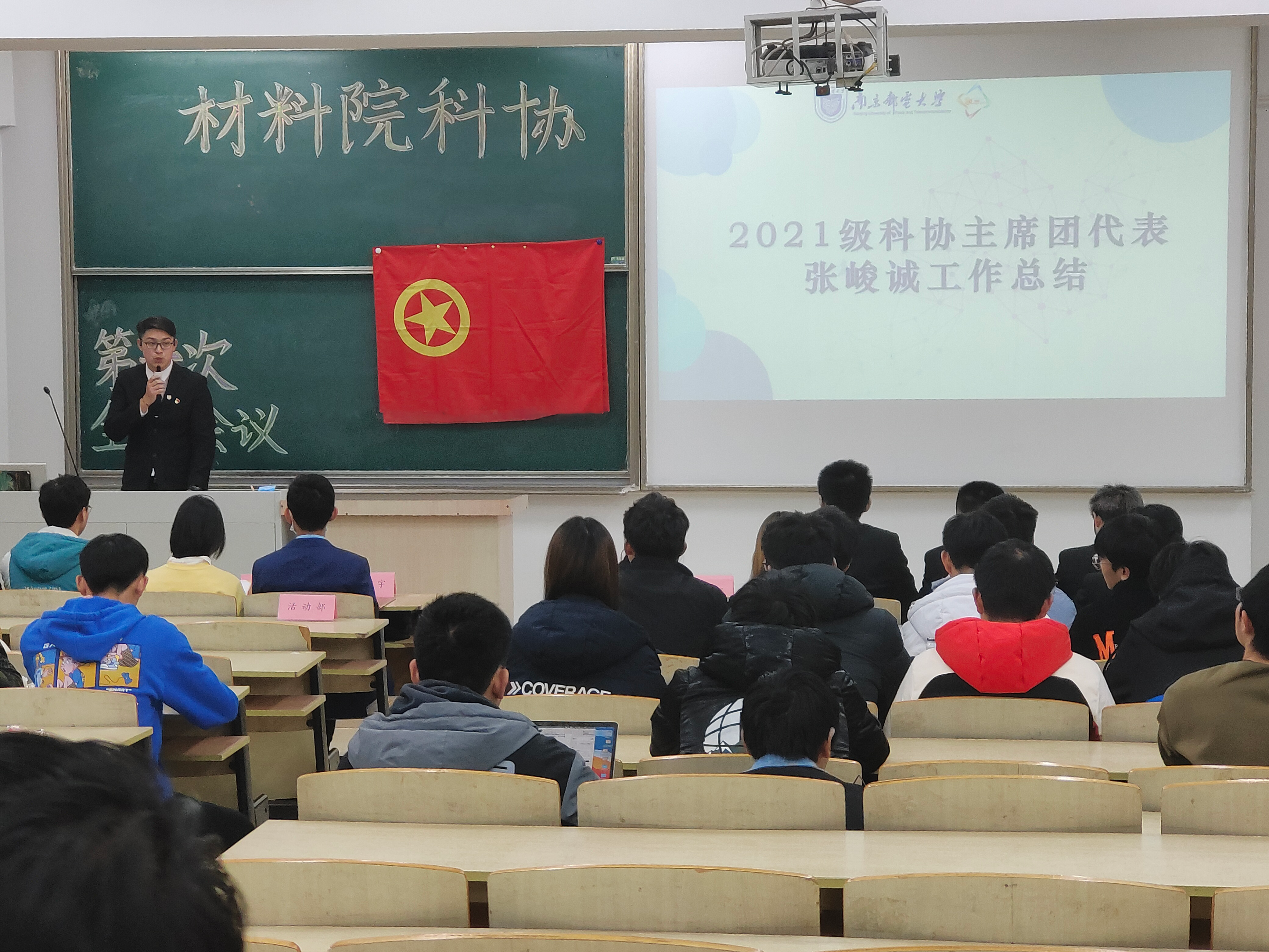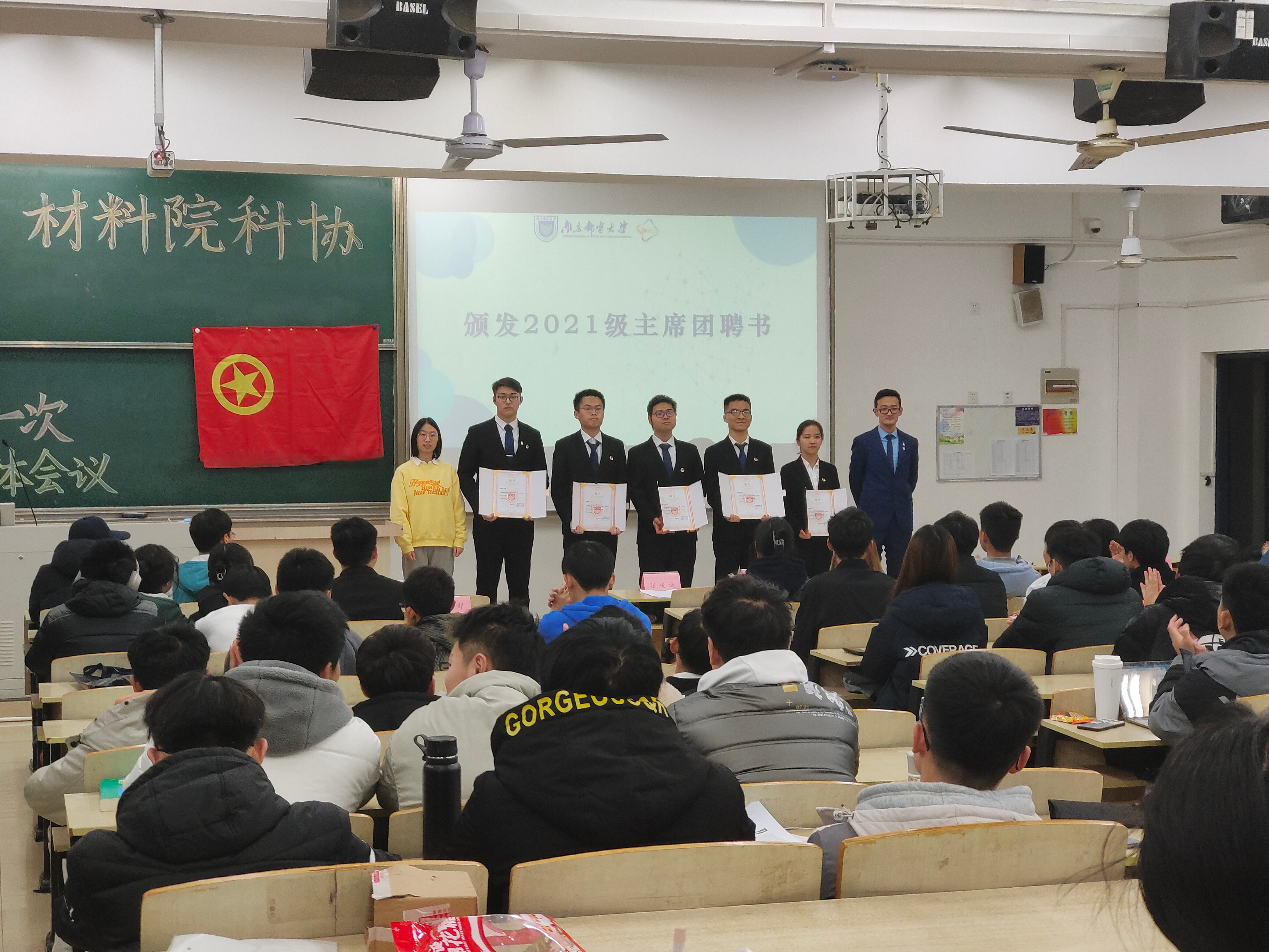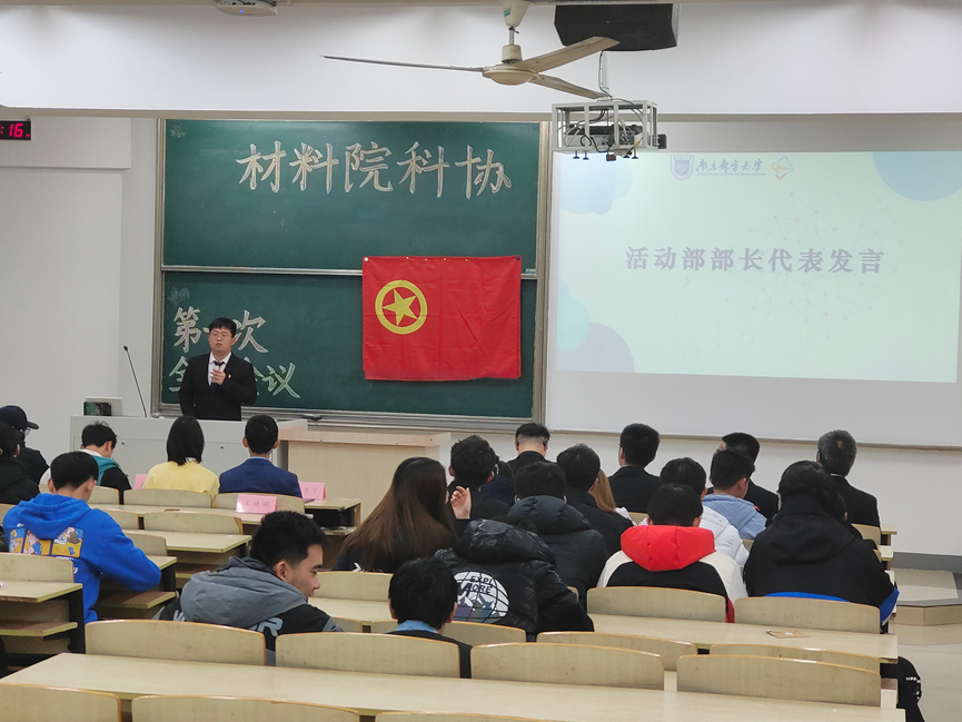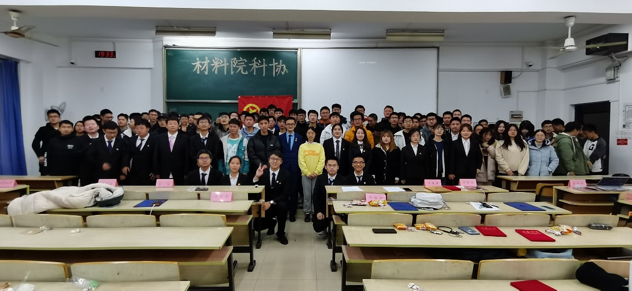 出席本次会议的有:材料院研究生会主席于海鹏,材料院员工会主席郭鹏浩,材智青协主席林嘉诚,材料院分团委秘书长朱佳,19级科协主席张宸宇,20级科协主席陈海燕以及本届科协全体成员。