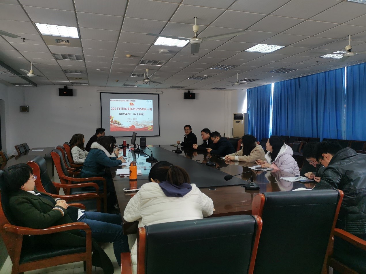 为深化支部全体党员对党的十九届六中全会精神和审议通过的《中共中央关于党的百年奋斗重大成就和历史经验的决议》的认识,强化学习效果,2021年11月30日,材料化学党支部在材料学科楼413会议室组织了“学史鉴今,实干前行”党史主题学习活动,党支部书记黄镇东同志讲授了党的六届七中全会的历史相关党史和我党审议通过的首份决议《关于若干历史问题的决议》。公司副经理、党委委员陈润锋同志参加了本次学习活动并进行了点评。