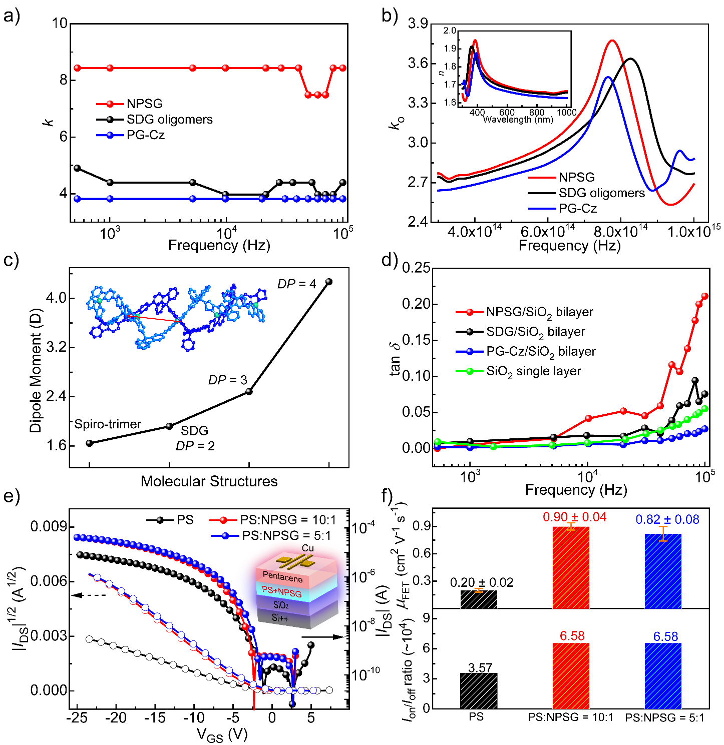 而后,作者发现纳米聚螺格可借助高度刚性骨架提高偶极极化作用,从而展现出高介电常数特征(k = 8.43),该特征可作为重要的介电掺杂剂应用于有机场效应晶体管。最后,将其和PS共混调控晶体管的介电层,发现PS:NPSG10:1)时并五苯的空穴载流子迁移率可以超过0.90 cm2/V.s,进一步证明了高介电NPSG材料的优势(图3)。
