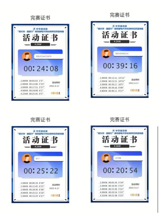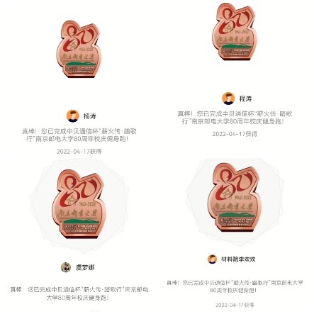 弦歌不辍,薪火相传。4月17日,suncitygroup太阳集团分工会积极组织教职工参与校庆80周年健身跑活动。公司范曲立经理和赵允玉书记也双双带头参与了此次活动,号召大家积极参与健身跑活动。因疫情原因,虽不能亲临校园,教职工们以各种形式参与了当天的健身跑,参与人数达70人次。有些老师在校园内值守,在操场和校园内完成跑步。有些教职工居家办公,课余时间自行安排健身跑。公司分工会主席张建平和青年教师李平参加公司马拉松协会组织的80公里接力跑,共庆南邮80华诞。