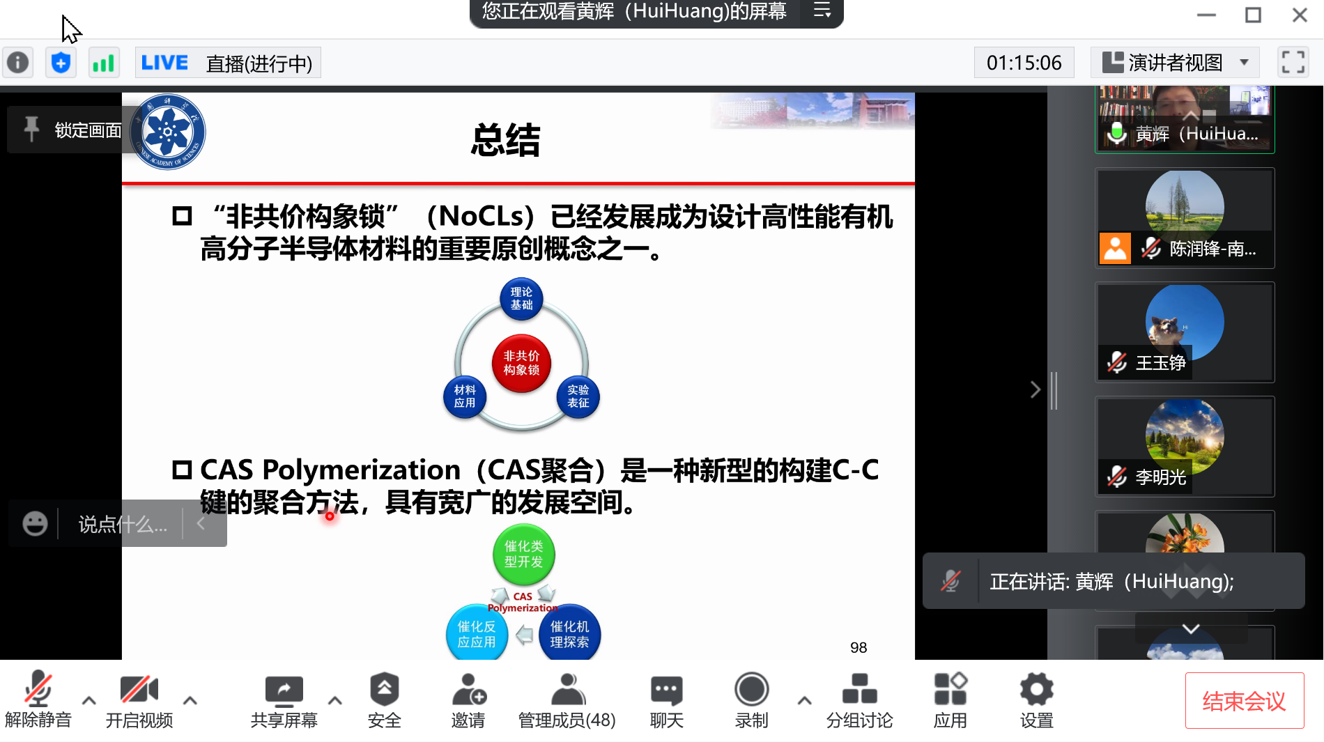 承国脉,薪火相传八十载;创未来,弘毅笃行谱新篇。值此南邮八十华诞校庆学术活动月之际,应公司陈润锋教授邀请,中国科公司大学黄辉教授于2022年4月29日下午2点在腾讯会议和腾讯直播上以“有机高分子半导体材料的设计与合成”为题作了一场精彩报告。材料院副经理陈润锋主持了报告,共有50余名师生参加了线上学习。