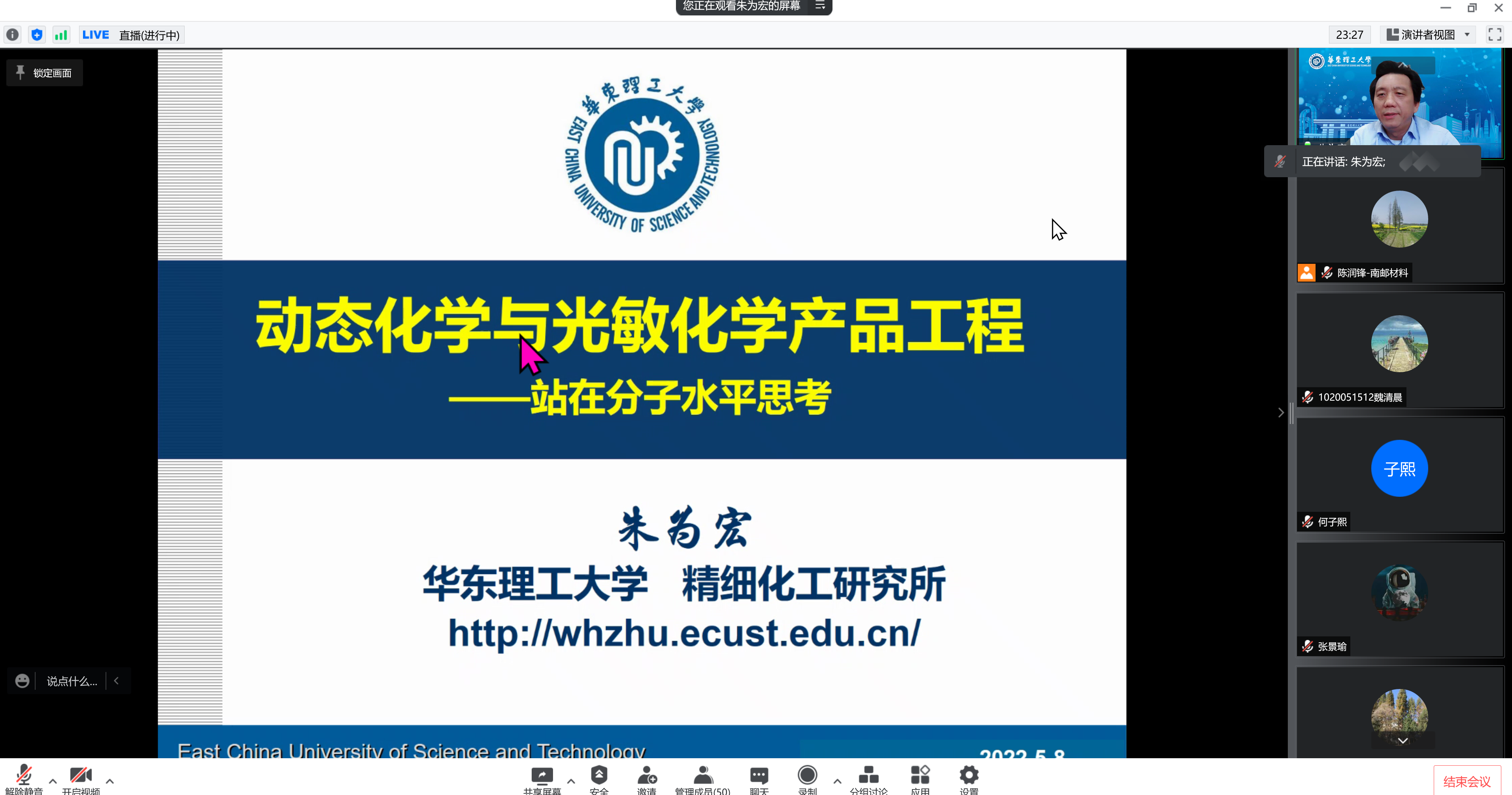 承国脉,薪火相传八十载;创未来,弘毅笃行谱新篇。值此南邮八十华诞校庆学术活动月之际,应公司陈润锋教授邀请,华东理工大学朱为宏教授于202258日(周二)下午2:30在腾讯会议和腾讯直播上为师生作了以动态化学与光敏化学产品工程为主题的学术报告。陈润锋教授主持了报告,线上共有近100名师生参加。