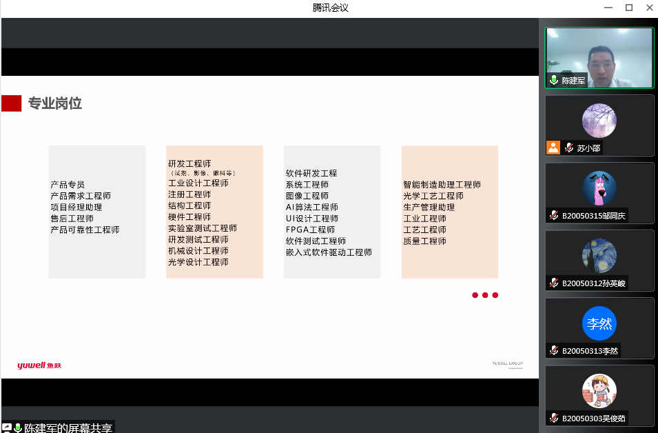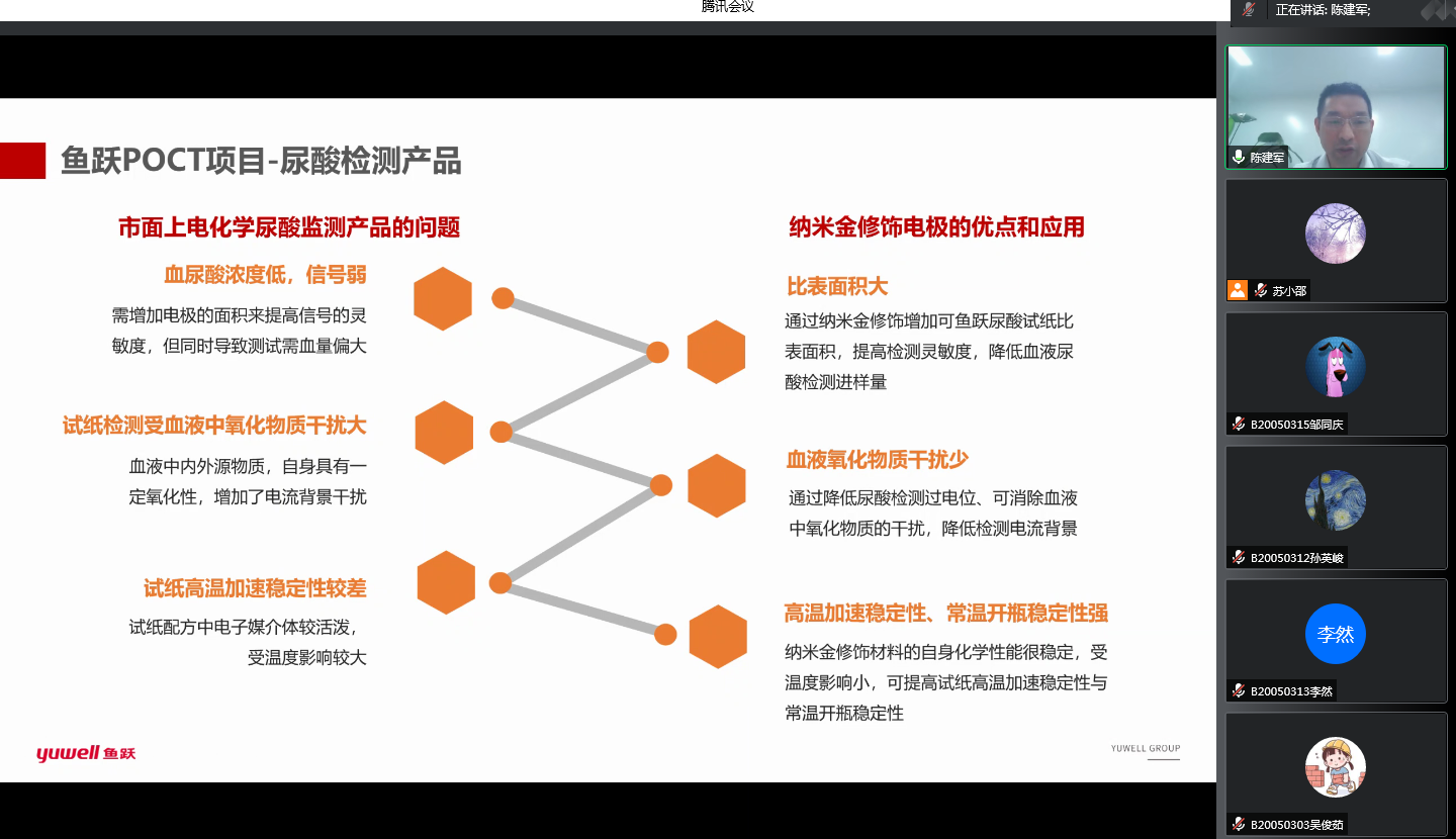 2022年5月31日上午9点半,南京鱼跃集团医疗POCT事业部总监陈建军为公司材料化学专业员工作了一场生动且富有实用意义的报告。报告由suncitygroup太阳集团材料化学系主任苏邵教授主持,系副主任周馨慧和B200503班全体同学参加了本次线上报告。