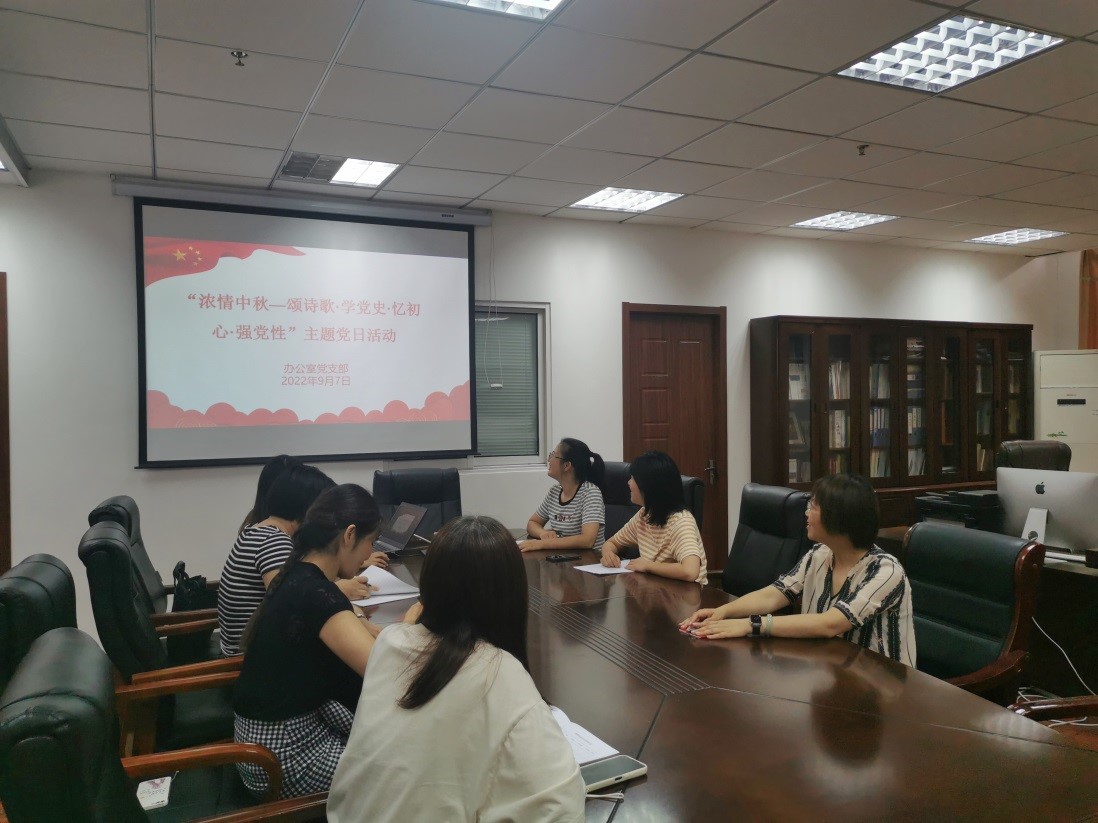 为迎接中华民族的传统节日中秋节,将党史学习教育与传统节日有机融合,推动党史学习教育走深走实,办公室党支部于9月7日下午召开“浓情中秋—颂诗歌·学党史·忆初心·强党性”主题党日活动。活动从“观一段影片”“诵一篇诗文”“讲一个故事”“谈一番感悟”四种形式将传统文化与党史学习教育相融合,实现了党史学习教育、革命精神等主旋律与中华民族传统文化的有机融合。