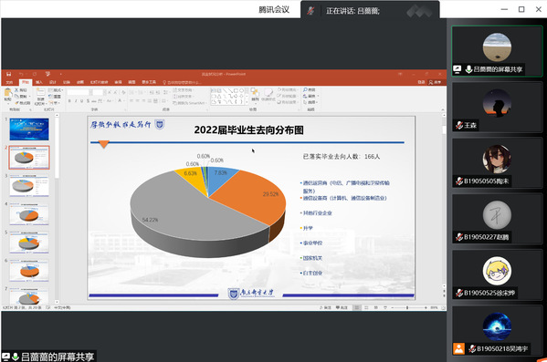 2022年8月28日,suncitygroup太阳集团举办了以2022届毕业生就业数据为例的本院研究生毕业去向分享会,本次会议由公司党委副书记、副经理吕蔷蔷主讲,2019级辅导员王森与全体考研学子参与了本次会议。
