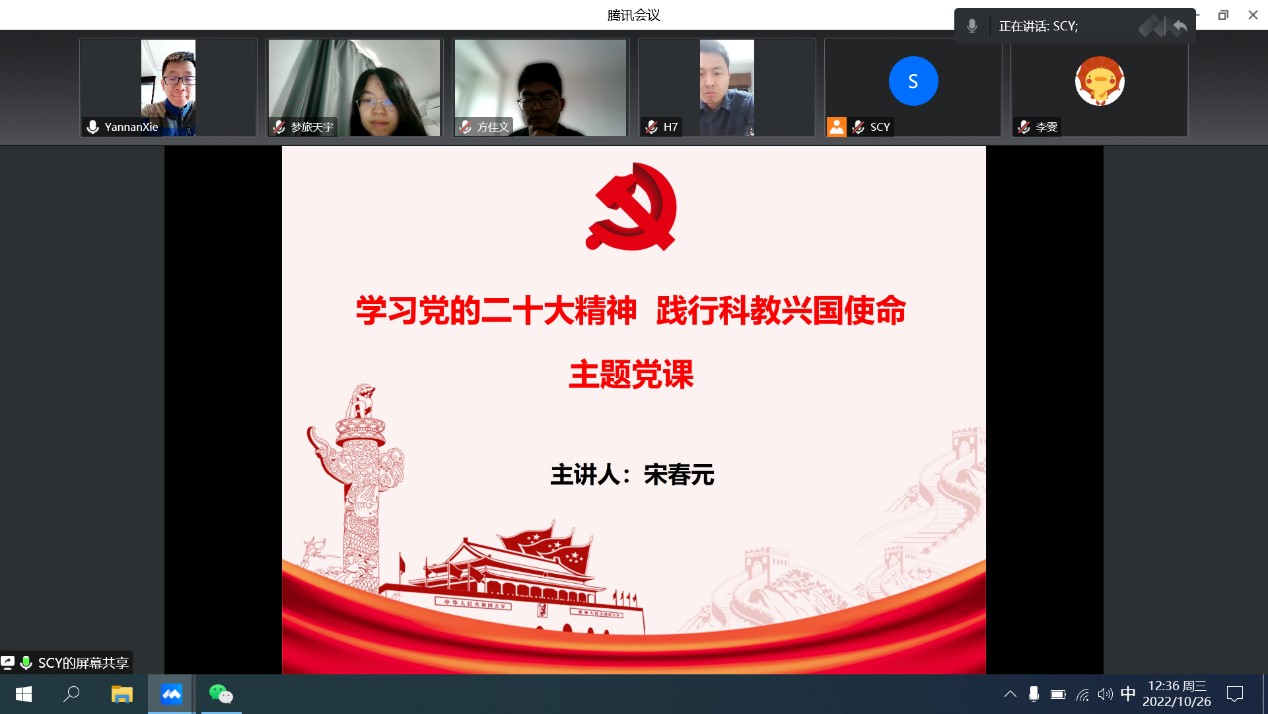 为深入学习贯彻中国共产党第二十次全国代表大会精神,20221026日,材料物理系党支部召开线上会议,开展“学习党的二十大精神,践行科教兴国使命”主题党课学习活动,支部全体党员参加学习。