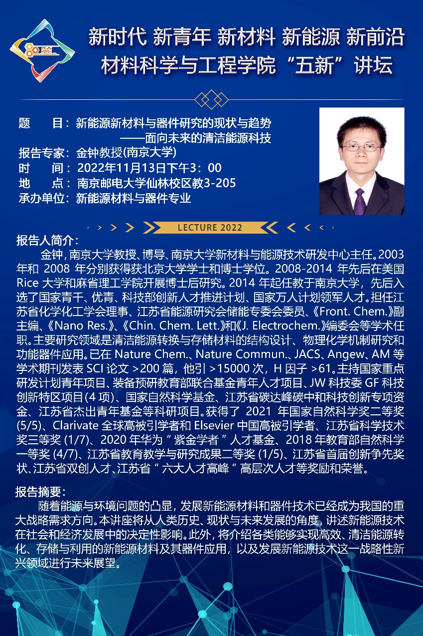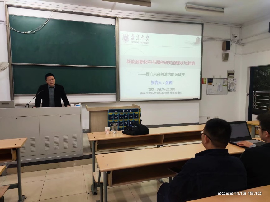 2022年11月13日下午,suncitygroup太阳集团在教3-205教室成功举办了第三期主旨为“新时代、新青年、新材料、新能源、新前沿”的“五新”讲坛。此次讲坛的主讲嘉宾为南京大学新材料与能源技术研究中心主任、国家领军人才、国家优秀青年基金获得者金钟教授。新能源材料与器件专业的全体员工和部分专业骨干老师及研究生参加了本次讲坛,本次讲坛由新能源材料与器件系主任黄镇东教授主持。