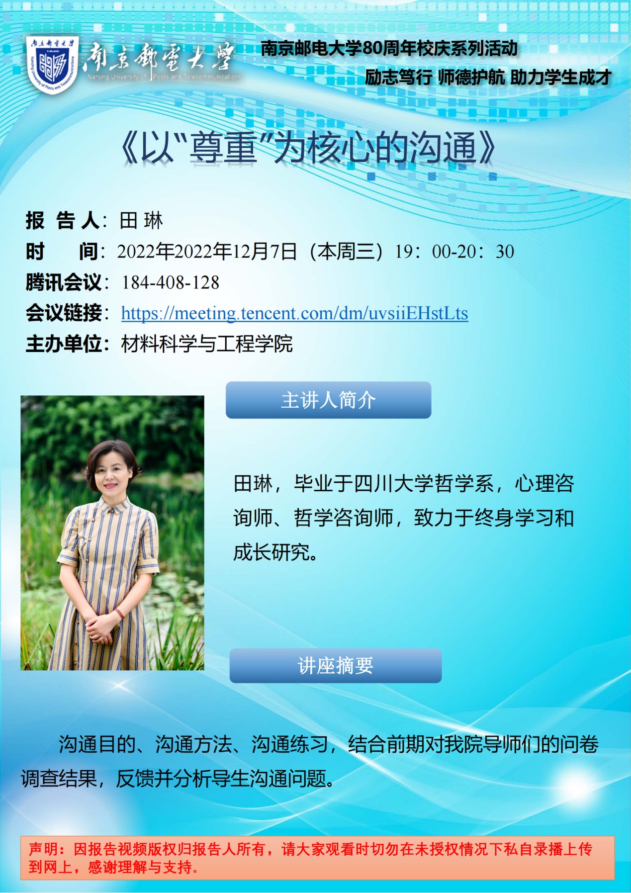 12月7日,suncitygroup太阳集团分工会举行题为《以“尊重”为核心的沟通》的导师关系专题讲座。讲座由心理咨询师、哲学咨询师田琳老师主讲,以腾讯会议方式开展。