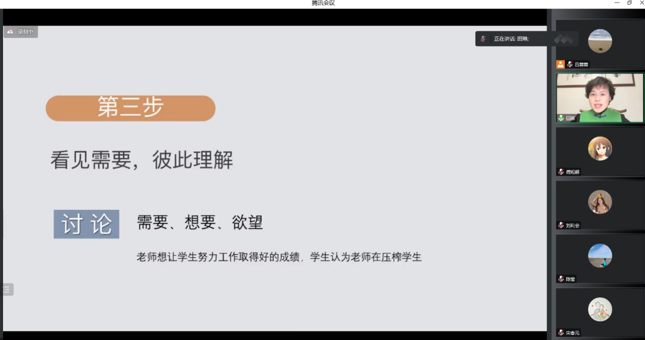 讲座的尾声,与会老师和主讲人就指导员工的具体沟通问题,做练习和互动,田琳老师指出,这些沟通技巧是基于“人与人是相互依存的”、“与人协作而不强迫”的意识来运用,目的是使人友爱互助,她希望能够帮助师生在指导和交流的过程中,带来被彼此更加理解的语言和行为输出,实现育人效果的改进。参会老师认为,学会沟通可以促进师生的科研和学习协作,非暴力沟通的方法需要在实际工作场景中加以练习和理解,方能增进师生关系,达到“润物细无声”的作用。