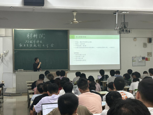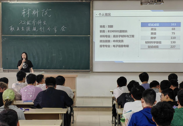 刘颖同学结合自身考研经历向同学们全面且详细地进行介绍,主要内容包括前期的院校选择、资料收集,中期的复习方法、时间规划以及情绪调节、经验收获等。陈龙同学从专业课学习方面向同学们提供建议,比如提前预习、抓住课堂时间、课后及时温故知新、多请教参身边同学及专业课老师。郑联克同学在秋招中顺利拿到拼多多录用通知,他从简历制作、笔试准备、面试训练等方面向同学们提供宝贵经验。张昊同学向同学们分享申请国外高校的经历,针对前期准备、申请条件、留学花费等提醒同学们要早做规划、厘清目标。