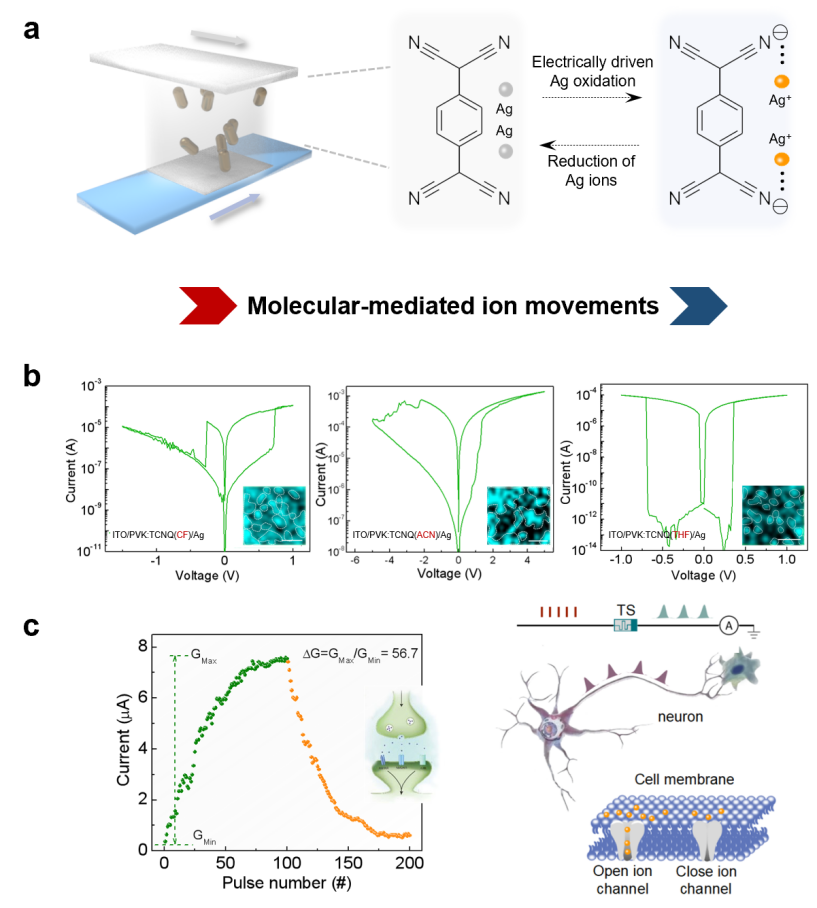 图1:(a)器件结构及配位机制示意图;(b)三种溶剂极性下对应的忆阻行为;(c)突触及神经元功能模拟