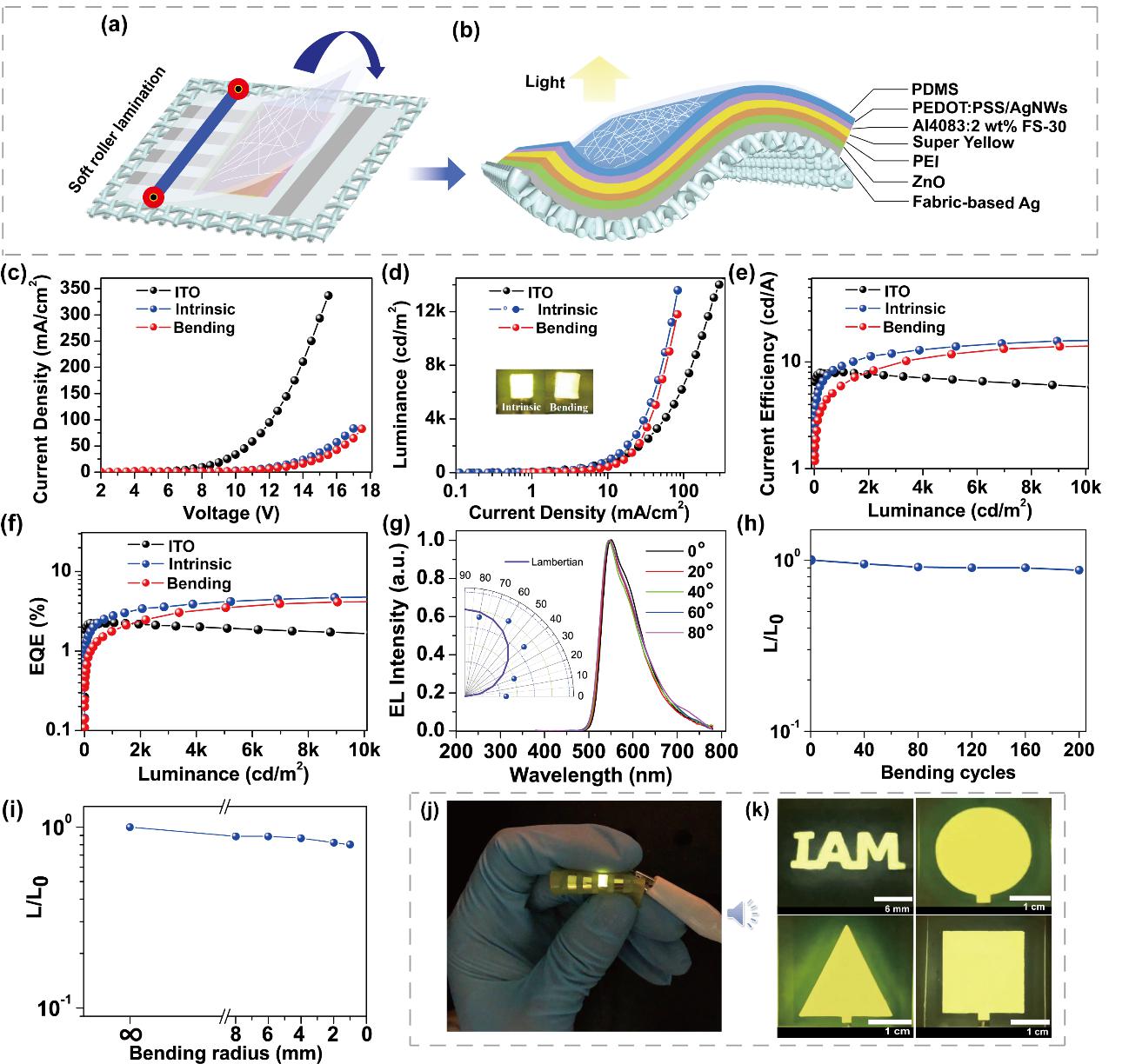 针对这一难题,suncitygroup太阳集团、有机电子与信息显示国家重点实验室张新稳教授与陈月花副教授课题组提出了柔性大面积RBE和TTE的全溶液印刷制备方案,研制出织物衬底的可穿戴顶发射聚合物发光器件(Fa-TPLED)。通过快速银镜反应并结合剥离技术在织物衬底上制备出高反射率银阴极(~94%)和高透光率的PDMS/AgNWs/PEDOT:PSS透明阳极(~84%),系统研究了TTE与衬底界面之间的分离机制。通过软接触层压制备出大面积Fa-TPLED,器件的电流效率为16.3 cd/A,外量子效率为4.9%,并且完全抑制了由微腔效应引起的发射光谱角度依赖性和非朗伯发射。此外,Fa-PLED具有优异的机械稳定性,在连续弯折200次(弯折半径为4 mm)后器件的电流效率仍能保持到14.3 cd/A。该研究成果为低成本、高效率的织物可穿戴器件的发展提供了一条新途径,在新兴的智能柔性/可穿戴电子产品中显示出巨大的应用潜力。相关结果以“Efficient Flexible Fabric-Based Top-Emitting Polymer Light-Emitting Devices for Wearable Electronics”为题发表在《Small》期刊上。重点实验室张新稳教授和陈月花副教授为共同通讯作者,李瑞卿博士为论文第一作者。