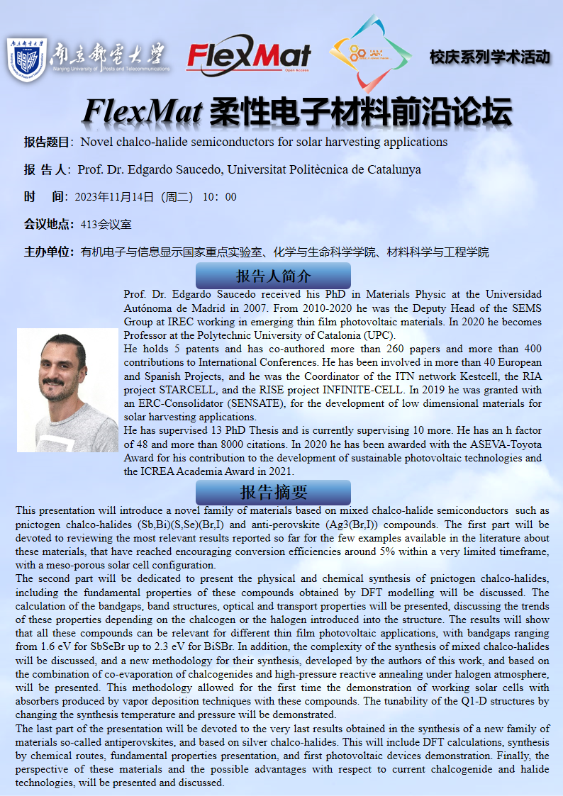 FlexMat柔性电子材料前沿论坛: 加泰罗尼亚理工大学 Prof. Dr. Edgardo Saucedo