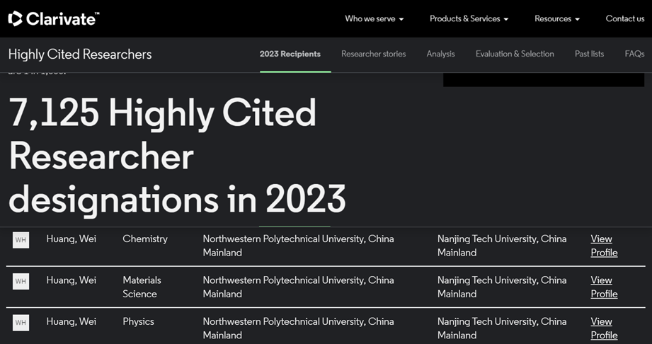 英国伦敦时间2023年11月15日,全球领先的专业信息服务商科睿唯安(Clarivate)公布了2023年度“全球高被引科学家”名单(Highly Cited Researchers 2023),遴选全球高校、研究机构和商业组织中对所在研究领域具有重大和广泛影响的顶尖科学人才。中国科公司院士、俄罗斯科公司外籍院士、美国国家工程院外籍院士、有机电子与信息显示国家重点实验室主任黄维院士连续数年再次入选该榜单。