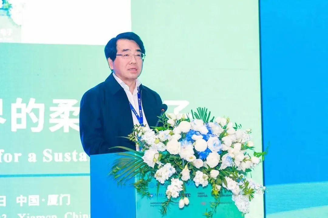 中国科公司院士黄维教授在大会开幕式上致辞。黄院士向在场的各位领导、编辑、专家及嘉宾表达了深深的感谢。黄院士表示,此次会议的核心是探索柔性电子技术的前沿,并期望它为人类社会可持续发展做出重要贡献。柔性电子的重要性不仅仅局限于电子产品的灵活设计,更关乎社会的可持续发展和经济的转型升级。IAM/IFE科研团队有一批活跃在柔性电子前沿的青年科学家,致力于推动柔性显示与照明、柔性光伏与储能、柔性传感与探测、健康监测与人机交互、公共安全和人形机器人、航天科技、电动汽车等领域的发展,为社会创造更大的价值。黄院士强调,科技工作者间的深度交流和合作至关重要,厦门大学柔性电子(未来技术)研究院热忱欢迎海内外柔性电子领域中青年科技工作者的加盟,共享科技创新、发展新机遇。最后,黄院士对所有参与会议的嘉宾、学者表示感谢,并对这次会议寄予美好祝愿。