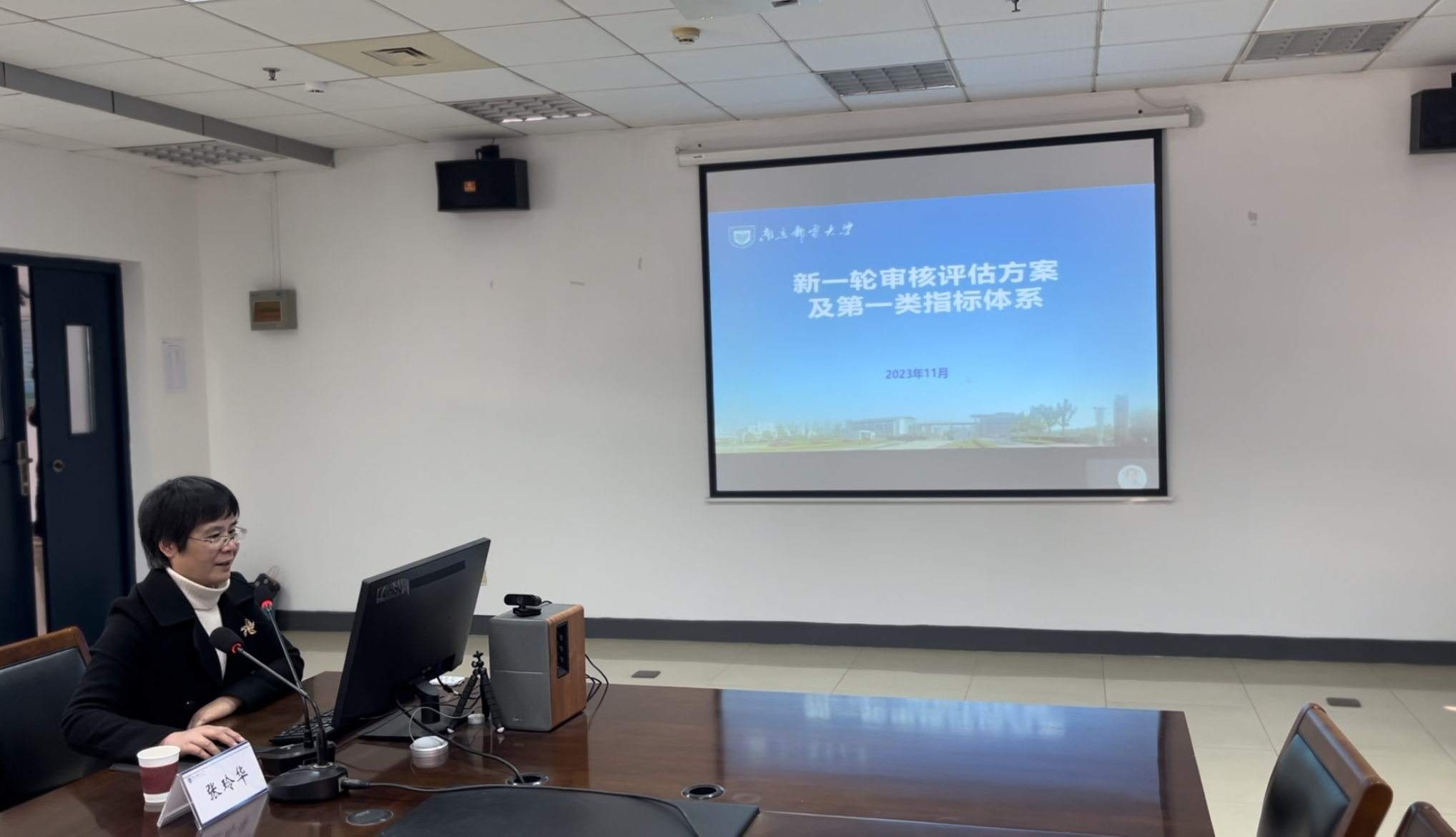 张玲华教授首先讲到,对待本科公司产品审核评估工作,全院教师要提高认识,实现人人参与的良好氛围。随后她从新一轮审核评估的基本原则、工作目标和重点问题三个方面进行了介绍,并指出了指标体系对自评报告撰写的引领作用,对新一轮审核评估的12个二级指标的内涵进行了详细解读。张玲华教授强调,在院级自评报告撰写过程中,凝练总结公司办学特色是关键。