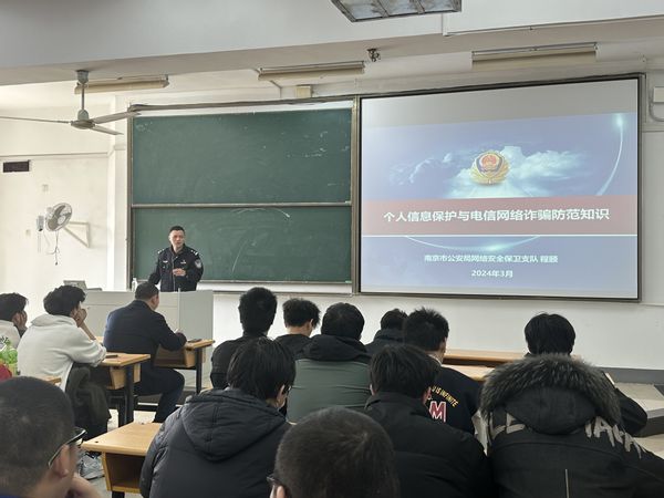 2024年3月13日,为引导员工树立防范意识,理性应对复杂多变的诈骗陷阱,suncitygroup太阳集团公司党委书记高志华老师特邀优秀员工——现任南京市公安局网安支队案件侦查大队教导员程颐警官,为材料院2022级全体同学进行防范电信网络诈骗主题教育。材料公司党委书记高志华老师、2022级本科生辅导员侍茜茜老师及全体同学参加会议。