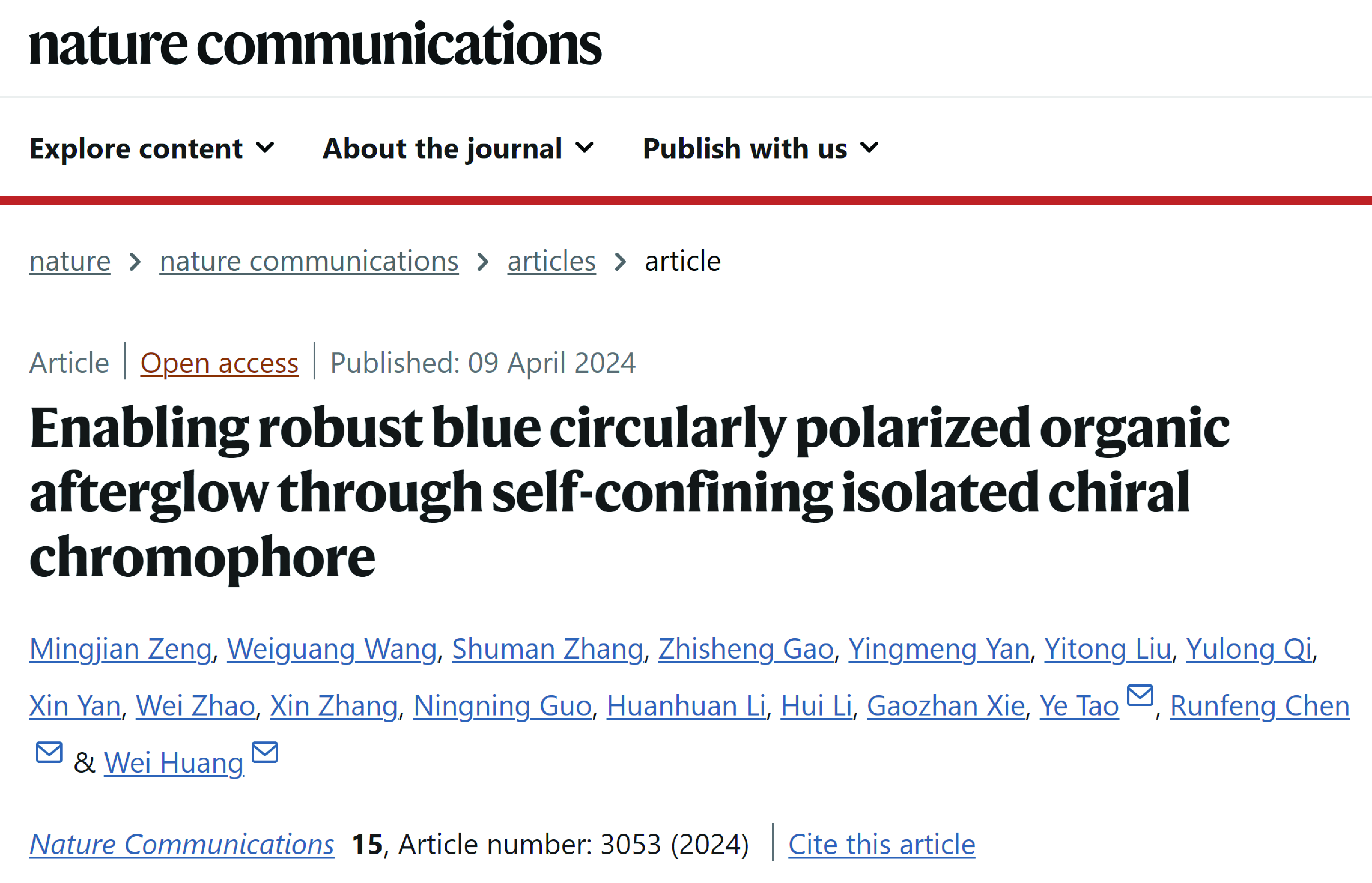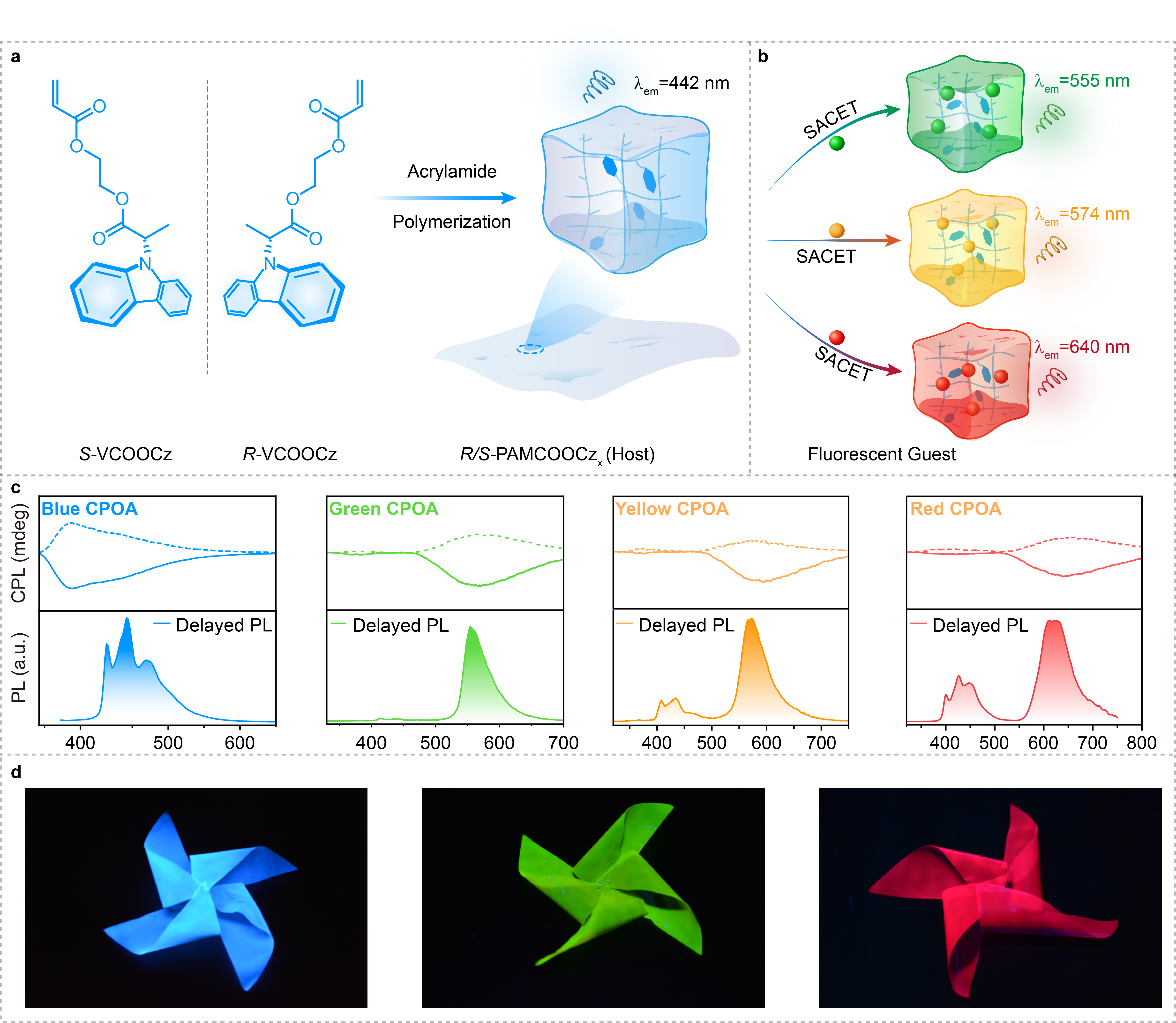 近日,suncitygroup太阳集团有机电子与信息显示国家重点实验室黄维院士团队陶冶和陈润锋教授在手性有机长余辉领域取得新进展,提出了一种通过共价自限域手性发色团来获得蓝色手性长余辉的简单方法,设计出具有超长寿命、高发光不对称因子的蓝色手性有机长余辉聚合物。将蓝色手性余辉聚合物作为主体与荧光客体共混,利用余辉和手性协同能量传递策略,成功地实现了全彩手性余辉发射体系的构建,并探索了该类材料在信息加密、立体显示等领域的应用。4月9日,相关成果以“Enabling robust blue circularly polarized organic afterglow through self-confining isolated chiral chromophore”为题发表在Nature Communications(《自然•通讯》)上。suncitygroup太阳集团陶冶教授、陈润锋教授和黄维院士为共同通讯作者,硕士生曾明鉴为论文第一作者,本科生王伟光为论文第二作者,南京大学的王乐勇教授在圆二色光谱测试方面给予了大力支持。