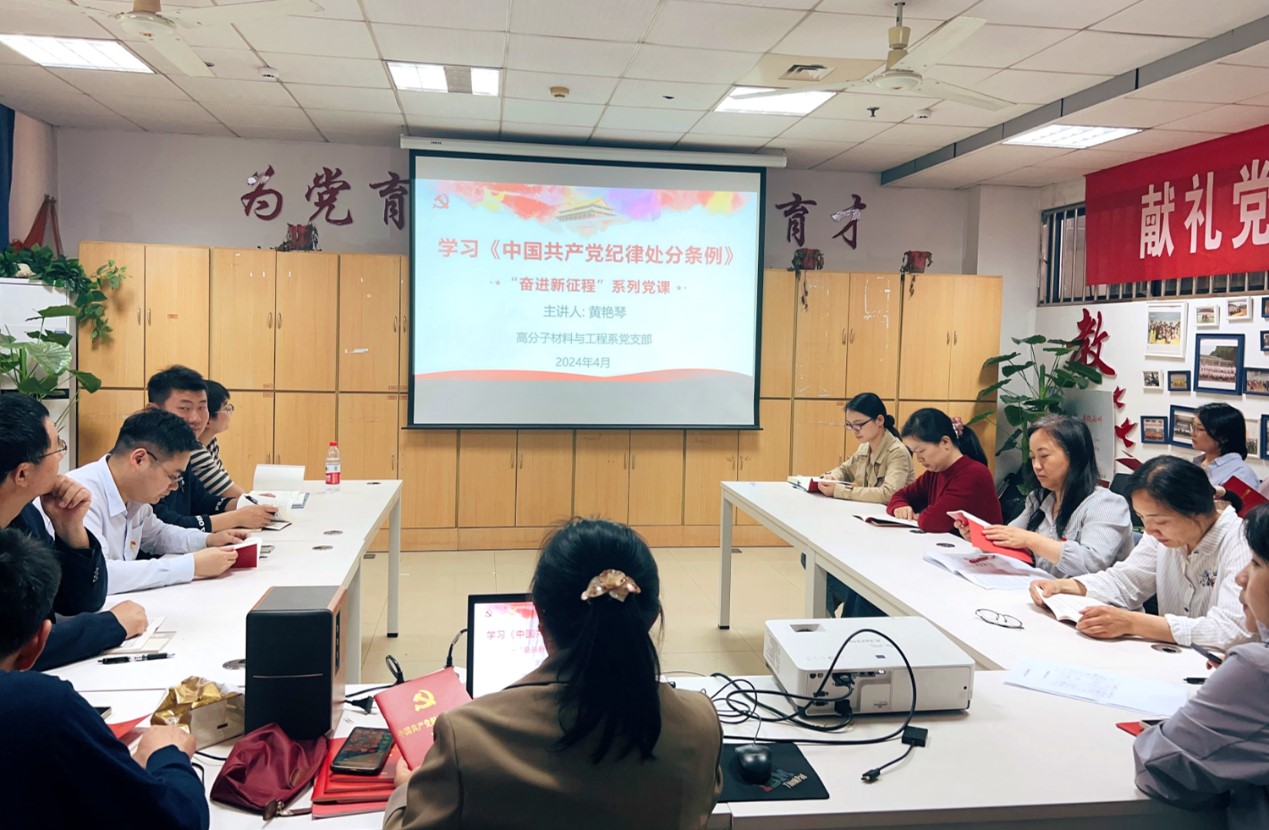 为深入学习领会新修订的《中国共产党纪律处分条例》,强化教师党员的纪律意识,引导党员加强自我约束,高分子材料与工程系党支部于近期召开了党员大会,支部书记黄艳琴同志带领支部全体党员开展了党纪学习教育专题党课,并逐条学习《条例》第一编。
