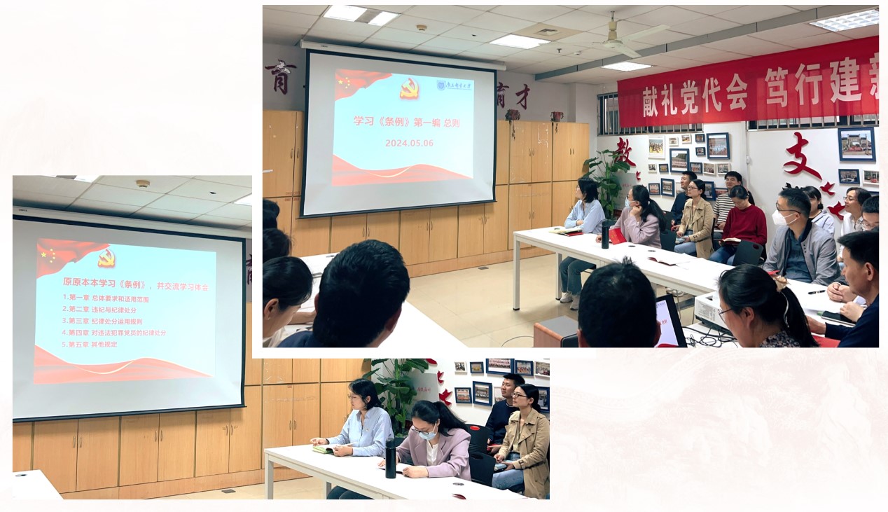 支部全体党员于5月6日又逐条学习了《中国共产党纪律处分条例》第一编总则,对加强党性修养、增强纪律意识、提高党纪执行力的重要性有了深刻的认知。党员同志们认真交流了学习体会,表示将以此次党纪学习为契机,不断强化党纪意识,切实增强思想和行动自觉,以学纪、知纪、明纪、守纪的优良纪律作风,凝聚教书育人的精气神,在新时代新征程上为公司发展和人才培养做出新贡献。