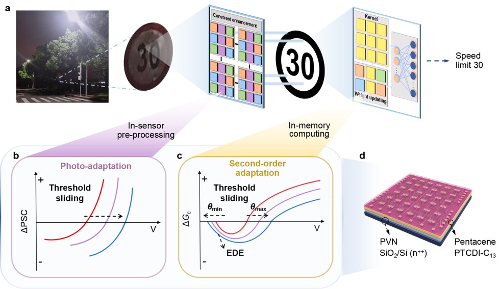 图:a)集成了图像预处理和识别功能的视觉系统示意图;b)光自适应阈值滑移、c)二阶自适应突触再可塑性和d)器件结构示意图